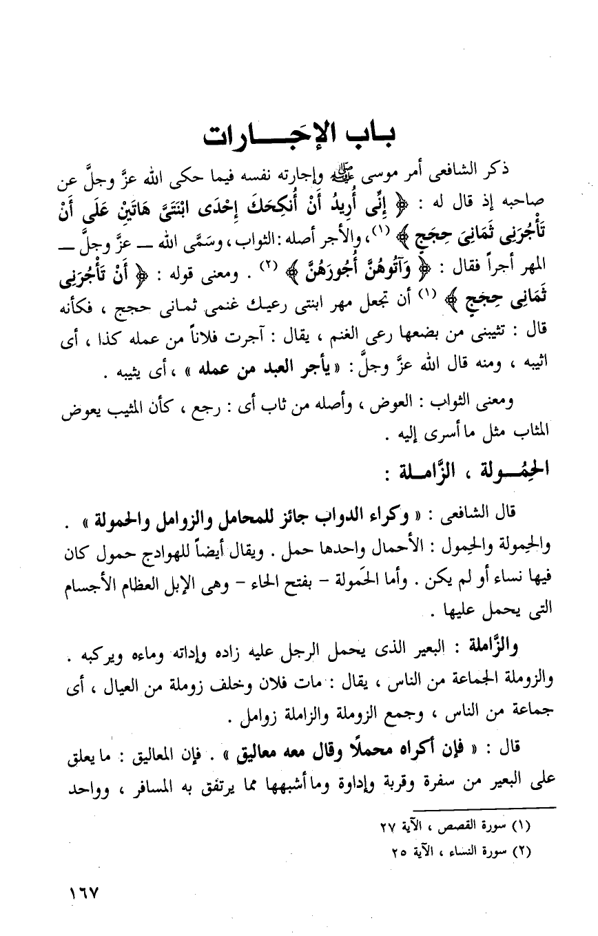 ذكر الشافعي أمر موسى عليه السلام وأجارته نفسه وما حكى الله عز وجل عن صاحبه إذا قال له: {إِنِّي أُرِيدُ أَنْ أُنْكِحَكَ إِحْدَى ابْنَتَيَّ هَاتَيْنِ عَلَى أَنْ تَأْجُرَنِي ثَمَانِيَ حِجَجٍ} 1 والاجر اصله الثواب وسمى الله تعالى المهر اجرا فقال: {وَآتُوهُنَّ أُجُورَهُنَّ} 2 ومعنى قوله {أَنْ تَأْجُرَنِي ثَمَانِيَ حِجَجٍ} 1 أن تجعل مهر ابنتي رعيك غنمي ثماني حجج فكأنه قال تثيبني من بضعها رعى الغنم يقال اجرت فلانا من عمله كذا وكذا أي اثبته منه قال الله عز وجل: "يأجر العبد من عمله" أي يثيبه.