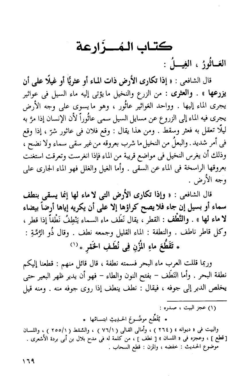 قال الشافعي:"اذا تكارى الأرض ذات الماء أو عثريا أو غيلا على أن يزرعها". والعثرى من الزروع والنخيل ما يؤتى إليه ماء السيل في عواثير يجرى الماء اليها وواحد العواثير عاثور وهو اتى يسوى على وجه الأرض يجرى فيه الماء إلى الزروع من مسايل السيل سمى عاثورا لان الإنسان إذا مر به ليلا تعقل به فعثر وسقط ومن هذا يقال وقع فلان في عاثور شر إذا وقع في امر شديد والبعل من النخل ما شرب بعروقه من غير سقى سماء ولا نضح وذلك أن تغرس النهل في مواضع قريبه من الماء فإذا انغرست وتعرقت استغنت بعروقا الراسخه في الماء عن السقي وأما الغيل والغلل فهو الماء الجاري على وجه الارض.
