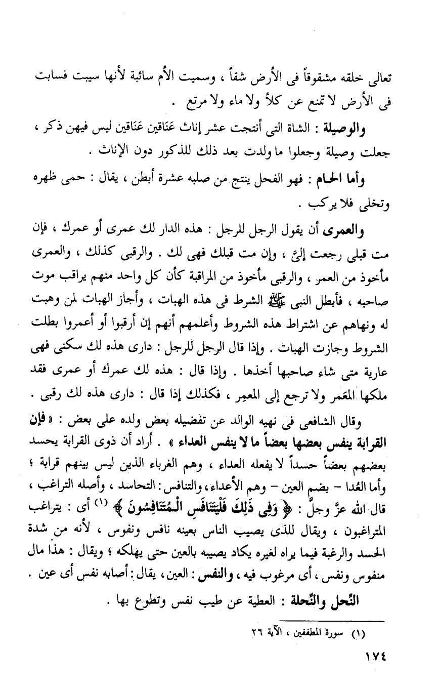 والعمرى أن يقول اللرجل للرجل هذه الدار لك عمرى أو عمرك فان مت قبلي رجعت إلى وان مت قبلك فهي لك. والرقبى كذلك والعمرى مأخوذه من العمر والرقبى مأخوذه من المراقبه كأن كل واحد منهما يراقب موت صاحبه فأبطل النبي صلى الله عليه وسلم الشرط في هذه الهبات وأجاز الهبات لمن وهبت له ونهاهم عن اشتراط هذه الشروط واعلمهم انهم إن ارقبوا أو اعمروا بطلت الشروط وجازت الهبات وإذا قال الرجل للرجل داري هذه لك سكنى فهي عاريه متى شاء صاحبها اخذها وإذا قال داري هذه لك عمرك أو عمري فقد ملكها المعمر ولا ترجع إلى المعمر وكذلك إذا قال داري هذه لك رقبى وقال الشافعي في نهيه الوالد عن تفضيله بعض ولده عل بعض: "فان القرابه تنفس بعضها بعضا ما لا ينفس العداء". أراد أن ذوي القرابه يحسد بعضا حسدا لا تفعله العدى وهم الغرباء الذين ليس بينهم قرابه وأما العدى بضم العين فهم الاعداء والتنافس التحاسد واصله التراغب قال الله عز وجل: {وَفِي ذَلِكَ فَلْيَتَنَافَسِ الْمُتَنَافِسُونَ} 1 أي فليتراغب المتراغبون ويقال للذي يصيب الناس بعينه نافس ونفوس لأنه من شدة الحسد والرغبه فيما يراه لغيره يكاد يصيبه بالعين حتى يهلكه ويقال هذا مال منفوس ونفيس أي مرغوب فيه والنفس العين يقال اصابه اصابه نفس أي عين. والنحل والنحله العطيه عن طيب نفس وتطوع بها.