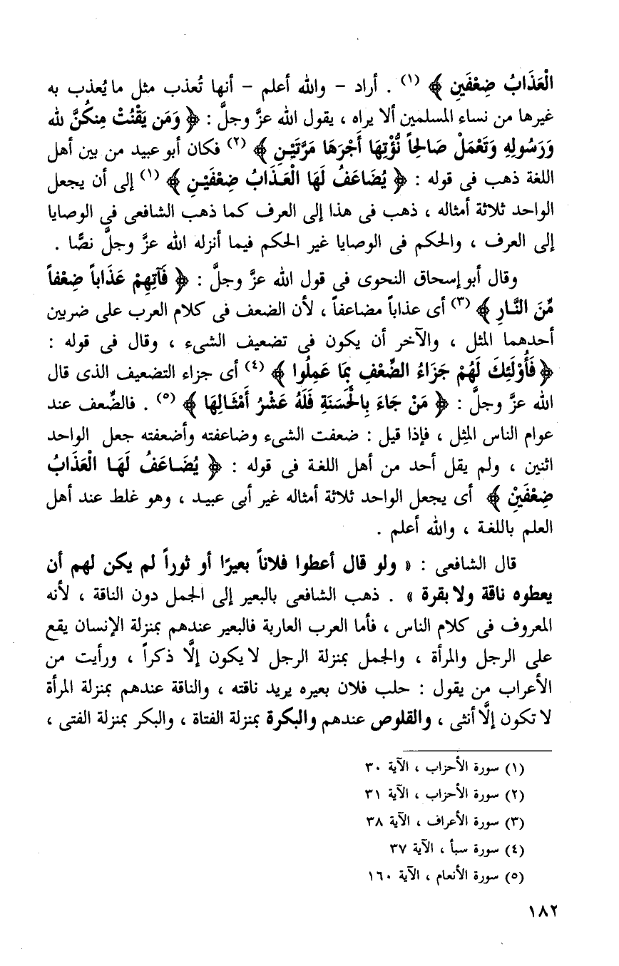 الْعَذَابُ ضِعْفَيْنِ} 1 أراد والله اعلم أنها تعذب مثلي ما يعذب به غيرها من نساء المسلمين الا تراه يقول الله عز وجل: {وَمَنْ يَقْنُتْ مِنْكُنَّ لِلَّهِ وَرَسُولِهِ وَتَعْمَلْ صَالِحاً نُؤْتِهَا أَجْرَهَا مَرَّتَيْنِ} 2 فكان أبو عبيده من بين أهل اللغة ذهب في قوله عز وجل: {يُضَاعَفْ لَهَا الْعَذَابُ ضِعْفَيْنِ} 1 إلى أن يجعل الواحد ثلاثة امثاله وذهب في هذا إلى العرف كما ذهب الشافعي في الوصايا إلى العرف والحكم في الوصايا غير الحكم فيما أنزله عز وجل نصا وقال أبو اسحاق النحوي في قوله عز وجل: {فَآتِهِمْ عَذَاباً ضِعْفاً مِنَ النَّارِ} 3 أي عذابا مضاعفا لأن الضعف في كلام العرب على ضربين أحدهما المثل والآخر أن يكون في معنى تضعيف الشيء وقال في قوله جل ثناؤه: {فَأُولَئِكَ لَهُمْ جَزَاءُ الضِّعْفِ بِمَا عَمِلُوا} 4 أي جزاء التضعيف الذي قال الله عز وجل: {مَنْ جَاءَ بِالْحَسَنَةِ فَلَهُ عَشْرُ أَمْثَالِهَا} 5 والضعف عند عوام الناس أنه مثلان فما فوقهما فأما أهل اللغة فالضعف عندهم في الأصل المثل فإذا قيل ضعفت الشيء وضاعفته واضعفته فمعناه جعل الواحد اثنين ولم يقل احد من أهل اللغةفي قوله تعالى: {يُضَاعَفْ لَهَا الْعَذَابُ ضِعْفَيْنِ} إنه يجعل الواحد ثلاثة أمثاله غير ابي عبيدة وهو غلط عند أهل العلم باللغة والله اعلم.