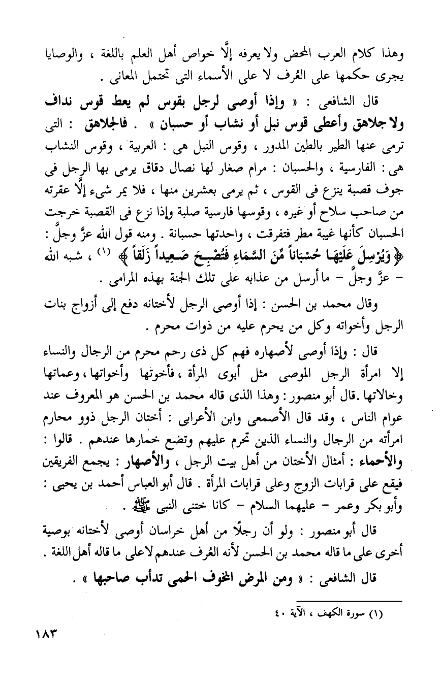 قال أبو منصور: ولو أن رجلا من أهل خراسان أوصى لاختانه بوصية أجرى على ما قاله محمد بن الحسن لأنه العرف عندهم لا على ما قاله أهل اللغة.