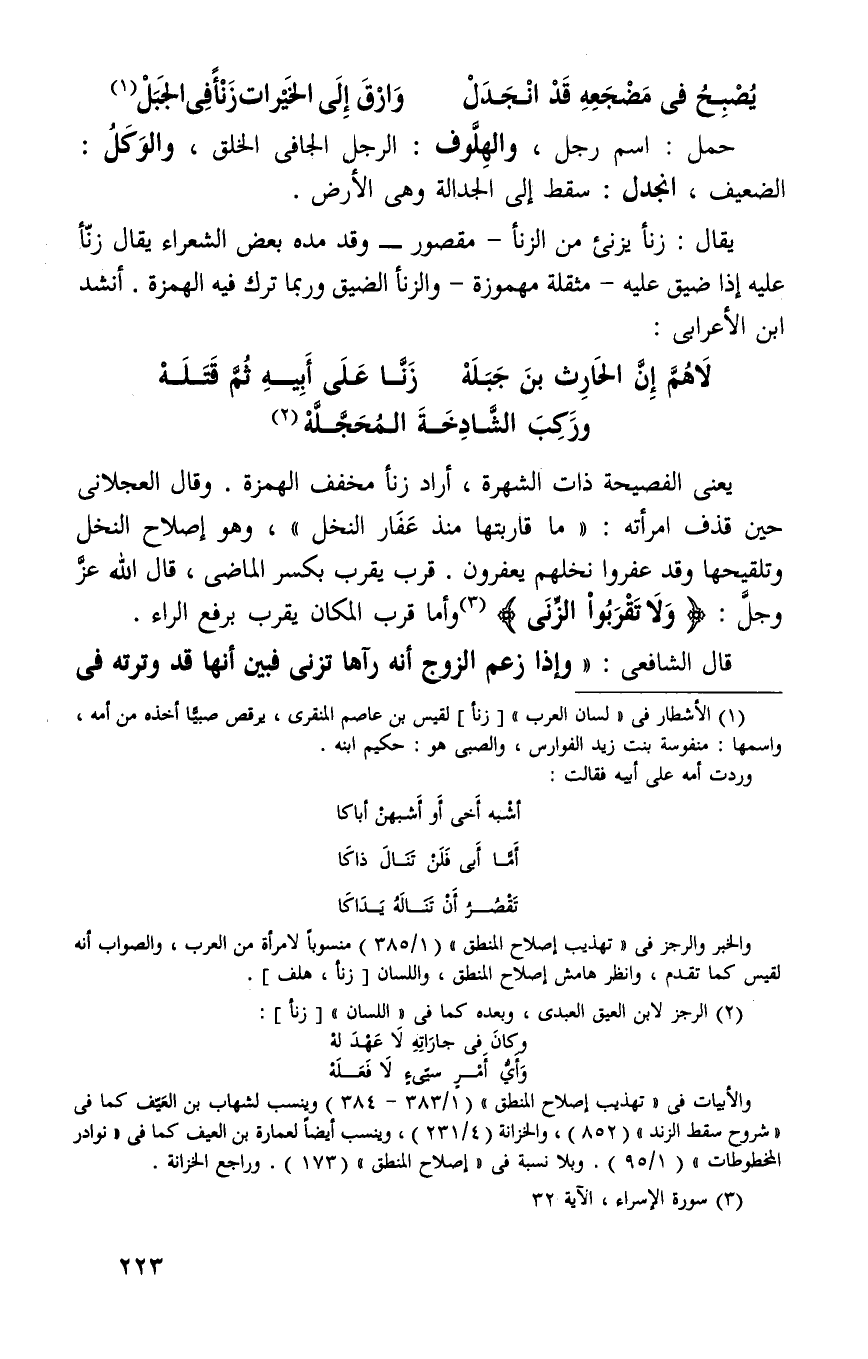 يعني الفضيحه ذات الشهره أراد زنا فخفف الهمزه وقال العجلاني حين قذف امرأته ما قربتها مذ عفار النخل وهو اصلاح النخل وتلقيحها وقد عفروا نخلهم يعفرون قرب يقرب بكسر الماضي قال الله عز وجل: {وَلا تَقْرَبُوا الزِّنَى} 3 وأما قرب المكان يقرب فبرفع الراء قال الشافعي: وإذا زعم الزوح انه راها تزني فبين انها قد وترته في