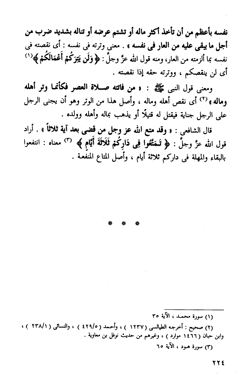 ومعنى قوله صلى الله عليه وسلم: "من فاتته صلاة العصر فكأنما وتر اهله وماله" 2 أي نقص أهله وماله