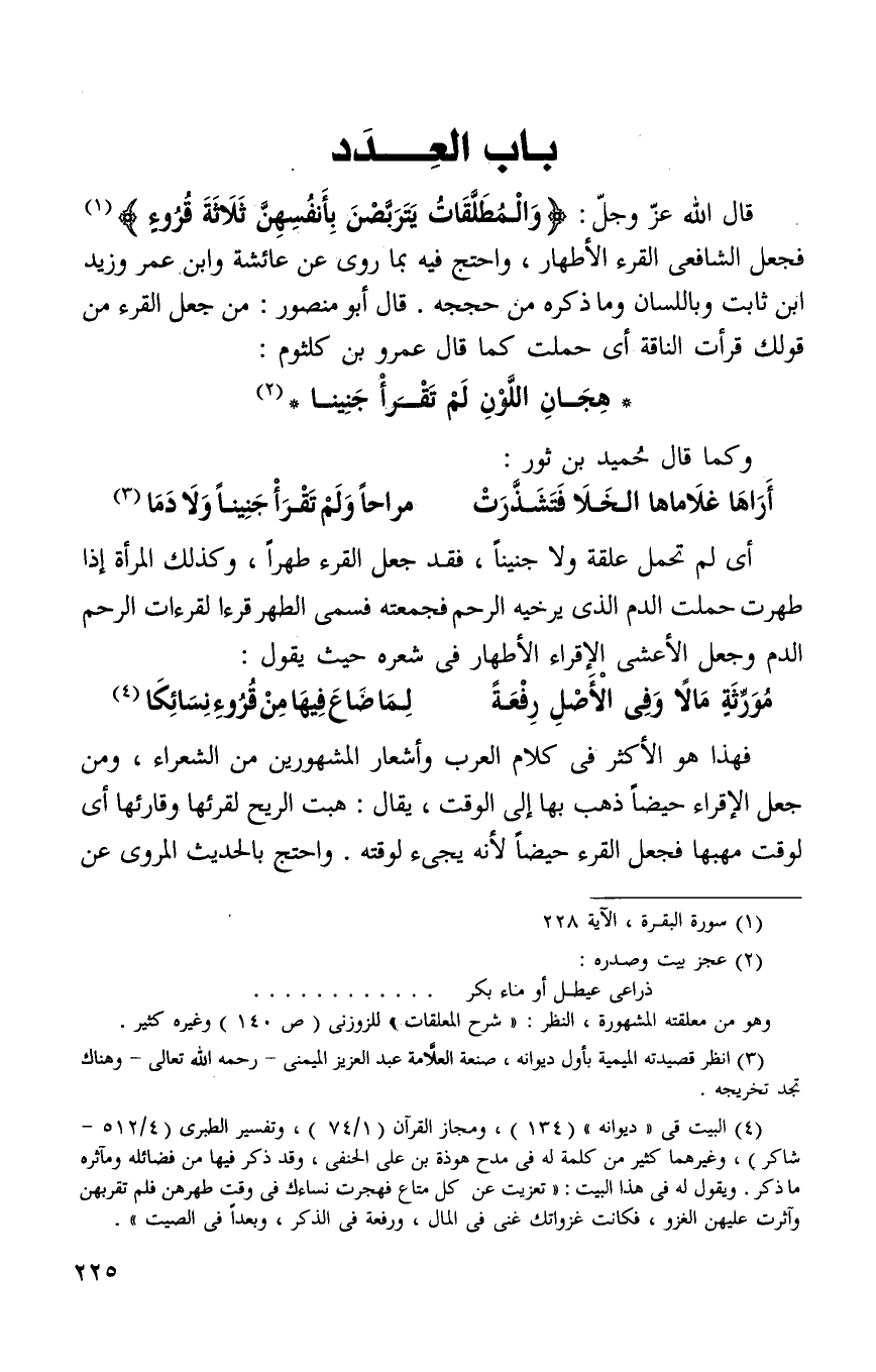 قال الله عز وجل: {وَالْمُطَلَّقَاتُ يَتَرَبَّصْنَ بِأَنْفُسِهِنَّ ثَلاثَةَ قُرُوءٍ} 1 فجعل الشافعي - رحمه الله - القروء الاطهار واحتج فيه بما روى عن عائشه وابن عمر وزيد بن ثابت رضي الله عنهم وباللسان وما ذكره من حججه قال أبو منصور: من جعل القروء من قولك قرأت الناقه أي حملت كما قال عمرو بن كلثوم: