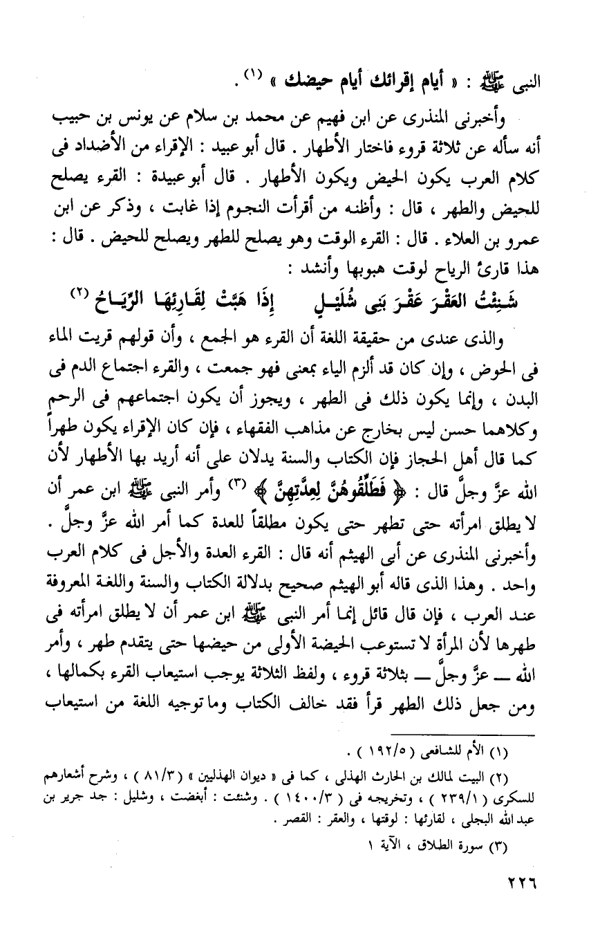 والذي عندي من حقيقة اللغة أن القرء هو الجمع وان قولهم قريت الماء في الحوض وان كان قد الزم الياء فهو بمعنى جمعت والقرء اجتماع الدم في البدن وإنما يكون ذلك في الطهر وقد يجوز أن يكون اجتماعه في الرحم وكلاهما حسن ليس بخارج عن مذاهب الفقهاء فإن كانت الاقراء تكون طهرا كما قال أهل الحجاز فإن الكتاب والسنه يدلان على انه اريد بها الاطهار لان الله عز وجل قال: {فَطَلِّقُوهُنَّ لِعِدَّتِهِنَّ} 3 وامر النبي صلى الله عليه وسلم ابن عمر أن يطلق امرأته حين تطهر حتى يكون مطلقا للعده كما امر الله عز وجل. واخبرني المنذري عن ابي الهيثم انه قال القرء والعده والاجل في كلام العرب واحد وهذا الذي قاله أبو الهيثم صحيح بدلالة الكتاب والسنه واللغة المعروفه عند العرب فإن قال قائل انما امر النبي صلى الله عليه وسلم ابن عمر أن يطلق امرأته في طهرها لان المرأة لا تستوعب الحيضه الاولى من حيضها حتى يتقدمها طهر وامر الله عز وجل بثلاثة قروء ولفظ الثلاثه يوجب استيعاب القروء بكاملها ومن جعل ذلك الطهر قرءا فقد خالف الكتاب وما توجبه اللغة من استيعاب