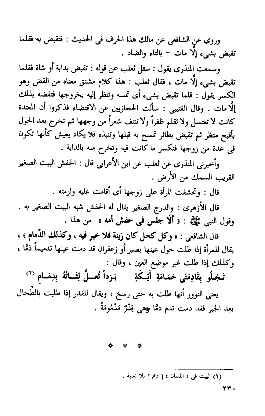 وسمعت المنذري يقول: سئل ثعلب عن قوله: تفتض بدابة إن شاة فقلما تفتض بشيء الا مات فقال ثعلب هذا كلام مستو ومعناه من الفض وهو الكسر يقول قلما تفتض بشيء أي تمسه وتنظر إليه بخروجها فتفضه بذلك الا مات. وقال القتبي: سألت الحجازيين عن الافتضاض فذكروا أم المعتدة كانت لا تغتسل ولا تقلم ظفرا وتنتف شعرا من وجهها ثم تخرج بعد الحول باقبح منظر ثم تفتض بطائر تمسح به قبلها وتنبذه فلا يكاد يعيش كأنها تكون في عدة من زوجها فتكسر ما كانت فيه وتخرج منه بالدابة.