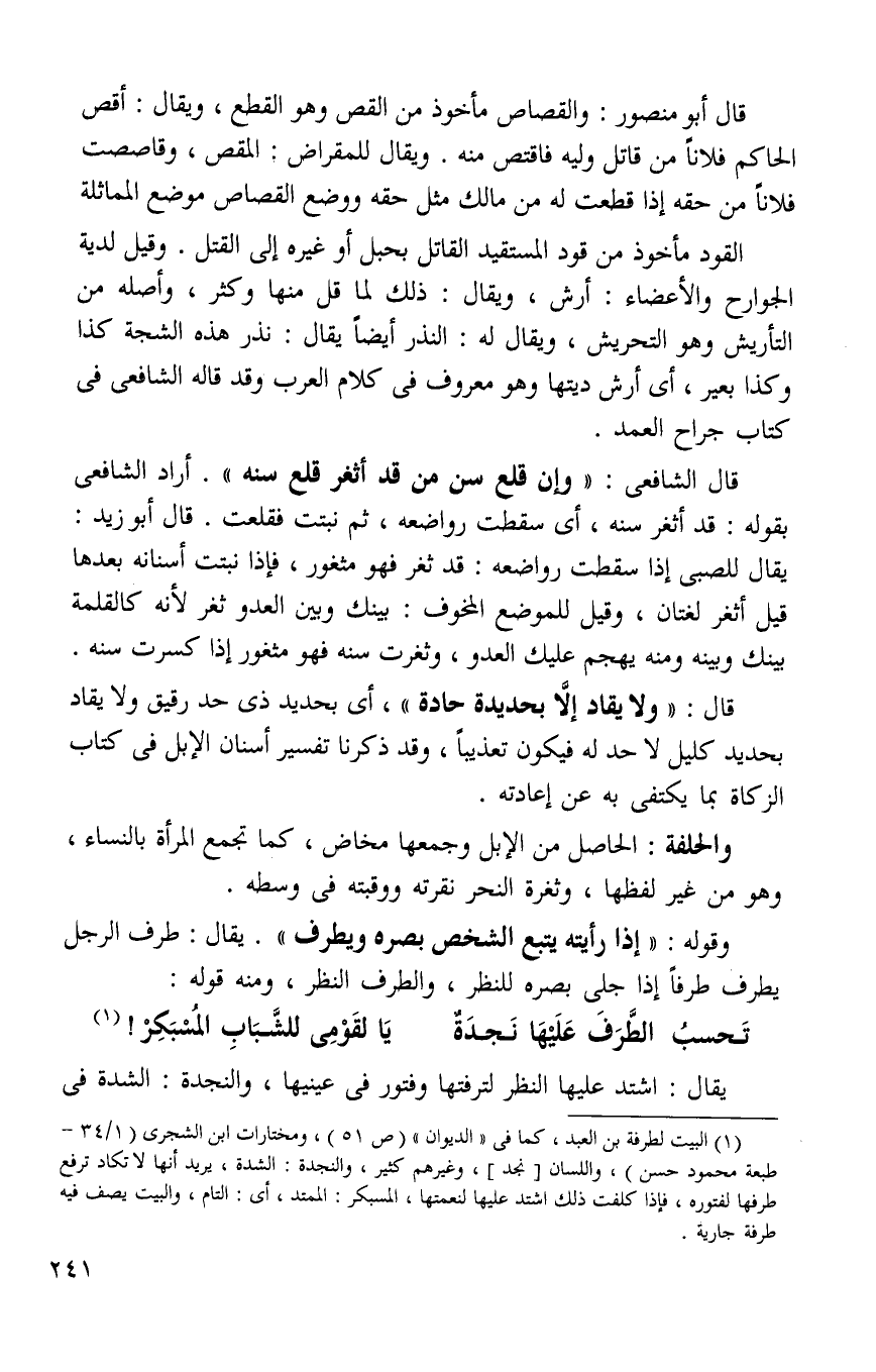 قال أبو منصور: والقصاص مأخوذ من القص وهو القطع ويقال اقص الحاكم فلانا من قاتل وليه فاقتص منه ويقال للمقراض مقص وقاصصت فلانا من حقه إذا قطعت له من مالك مثل حقه ووضع القصاص موضع المماثله القود مأخوذ من قود المستقيد القاتل بحبل وغيره إلى القتل وقيل لديه الجوارح والاعضاء ارش يقال ذلك لما قل منها وكثر واصله من التاريش وهو التحريش ويقال له النذر ايضا يقال نذر هذه الشجه كذا وكذا بعيرا أي ارش ديتها وهو معروف في كلام العرب وقد قاله الشافعي - رحمه الله - في كتاب جراح العمد.