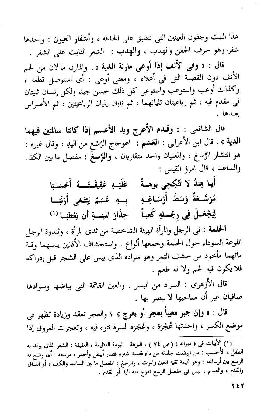 والحلمه: من الرجل والمرأة الهنيه الشاخصه من ثدي المرأة وثندوة الرجل واللوعه السواد حول الحلمه وجمعها الواع واستشحاف الاذنين يبسهما وقلة مائهما مأخوذ من حشف التمر وهو سارده الذي يبس على الشجر قبل ادراكه فلا يكون فيه لحم ولا له طعم.