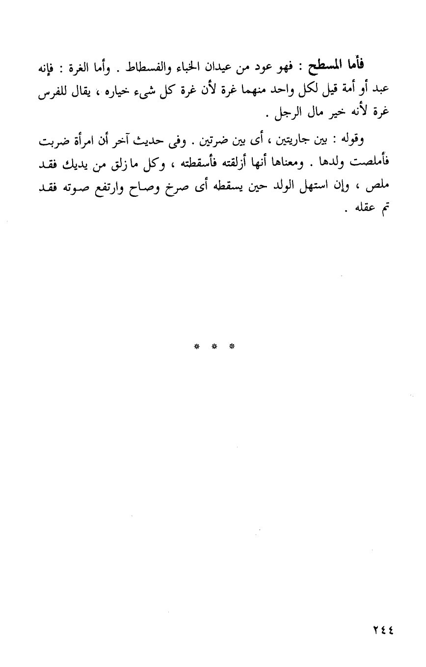 فاما المسطح: فهو عود من عيدان الخباء والفسطاط وأما الغرة فانه عبد أو امة قيل لكل واحد منهما غرة لان غرة كل شيء خياره ويقال للفرس ايضا غره لأنه خير مال الرجل.