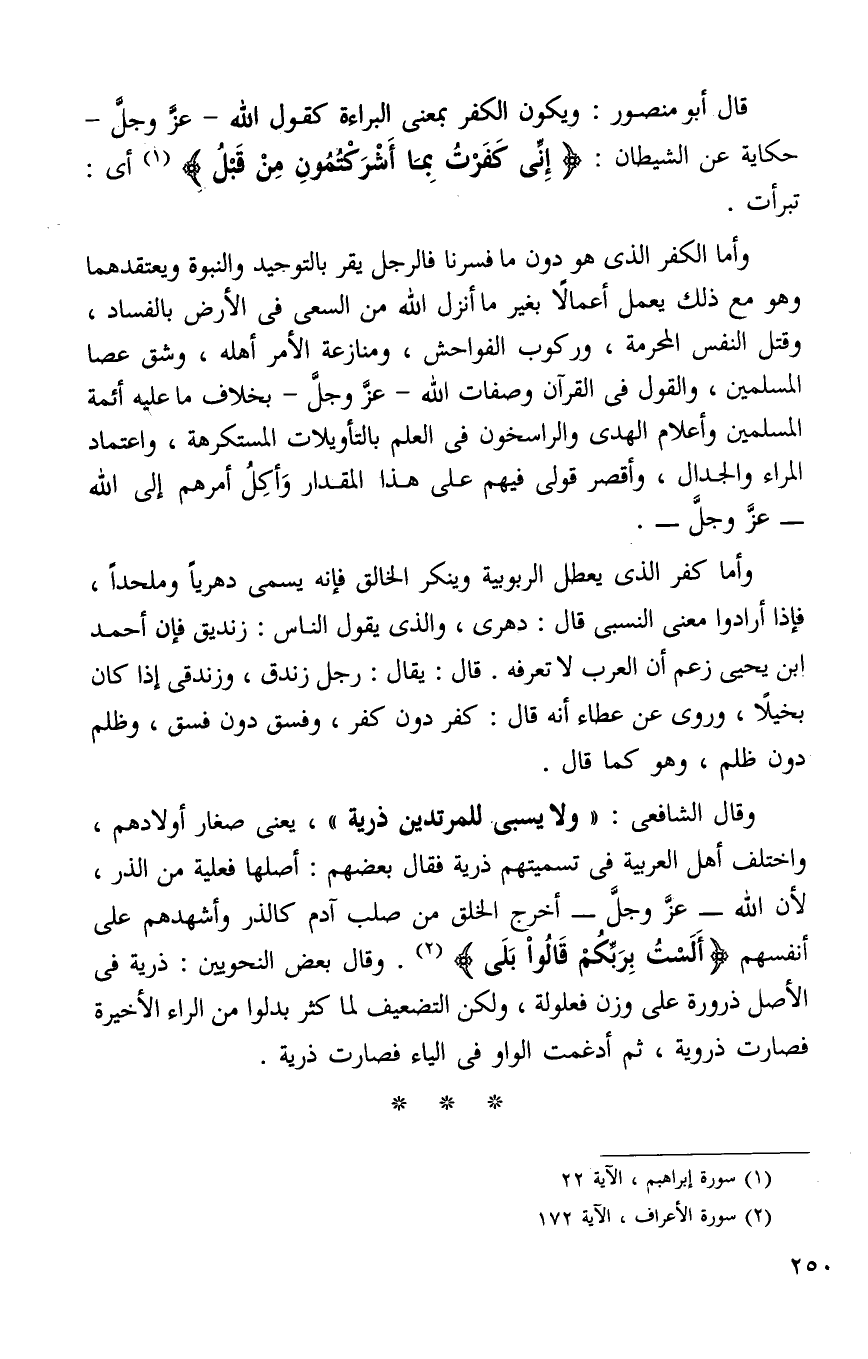قال أبو منصور: ويكون الكفر بمعنى البراءه كقول الله عز وجل: حكاية عن الشيطان: {إِنِّي كَفَرْتُ بِمَا أَشْرَكْتُمُونِ مِنْ قَبْلُ} 1 أي تبرأت