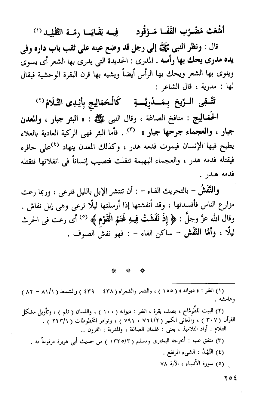 والنفش بالتحريك الفاء: أن ينتشر الابل بالليل فترعى وربما رعت مزارع الناس فأفسدتها وقد أنفشتها إذا أرسلتها ليلا ترعى وهي إبل نفاش قال الله عز وجل: {إِذْ نَفَشَتْ فِيهِ غَنَمُ الْقَوْمِ} 5 أى رعت في الحرث ليلا وأما النفش ساكن الفاء فهو نفش الصوف.