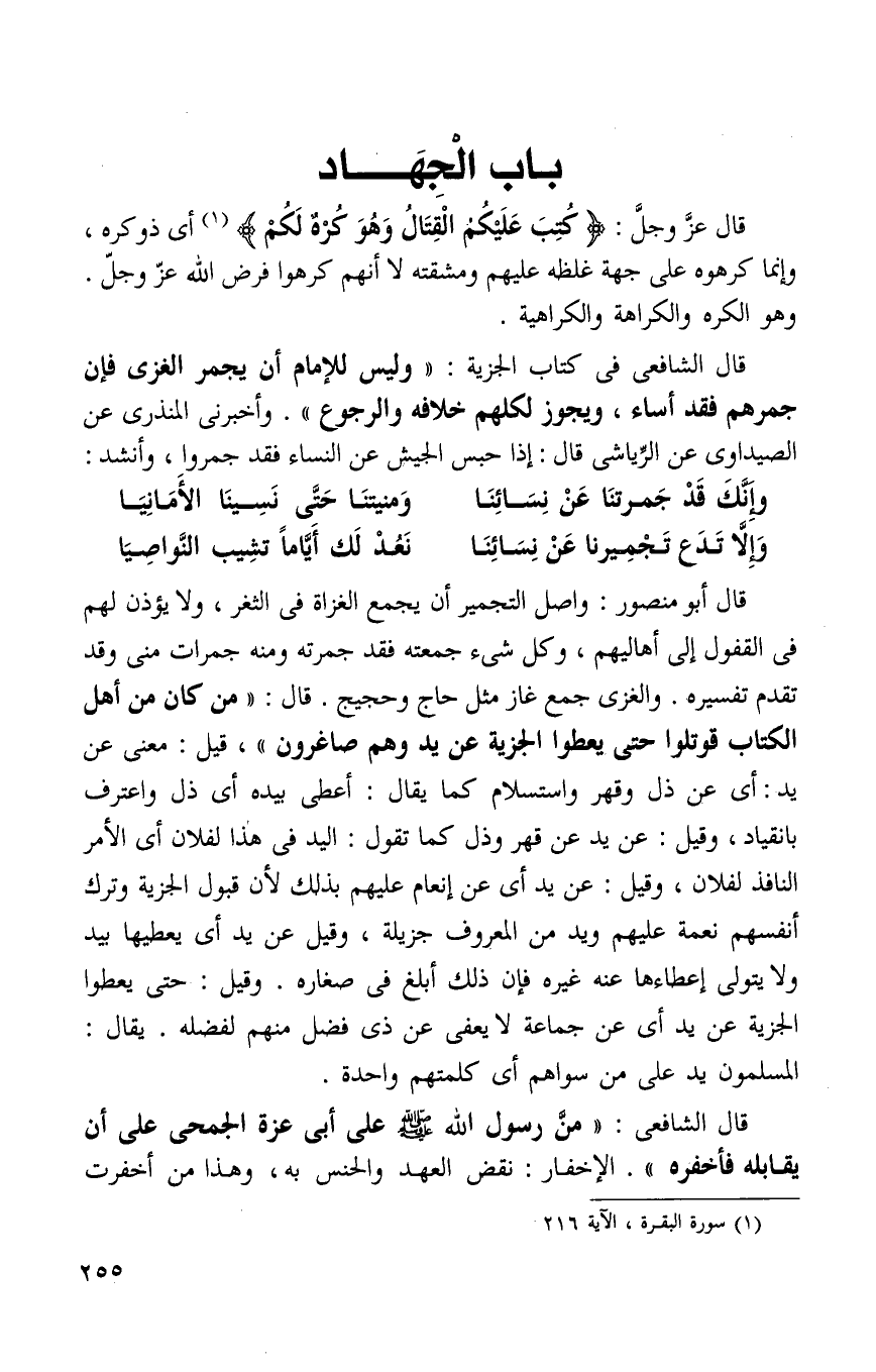 قال الشافعي: في كتاب الجزيه: وليس للامام أن يجمر الغزى فان جمرهم فقد اساء ويجوز لكلهم خلافه والرجوع. واخبرني المنذري عن الصيداوي عن الرياشي قال إذا حبس الجيش عن النساء فقد جمروا وانشد