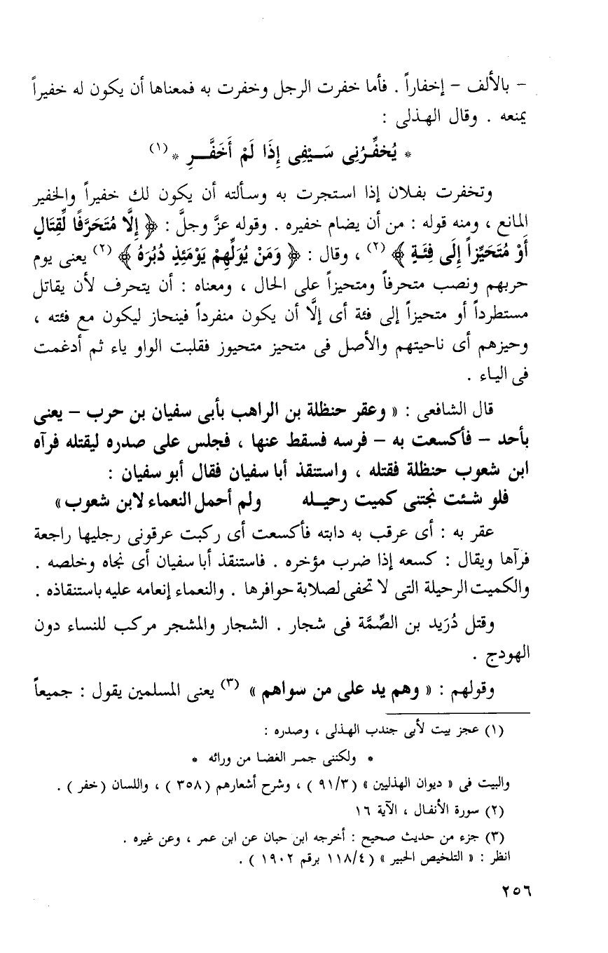 وقوله عز وجل: {إِلَّا مُتَحَرِّفاً لِقِتَالٍ أَوْ مُتَحَيِّزاً إلى فِئَةٍ} وقال {وَمَنْ يُوَلِّهِمْ يَوْمَئِذٍ دُبُرَهُ} 2 يعني يوم حربهم ونصب متحرفا ومتحيرا على الحال معناه أن يتحرف لان يقاتل مستطردا وهو إذا رأى فارسا تعمد أن يستطرد له متحرفا عن قتاله لكي يتبعه فيجد فرصه فيكر عليه ومتحيزا إلى فئه أي الا أن يكون منفردا فينحاز مع فئه وحيزهم أي ناحيتهم والاصل في متحيز متحيوز فقلبت الواو ياء ثم أدغمت في الياء.