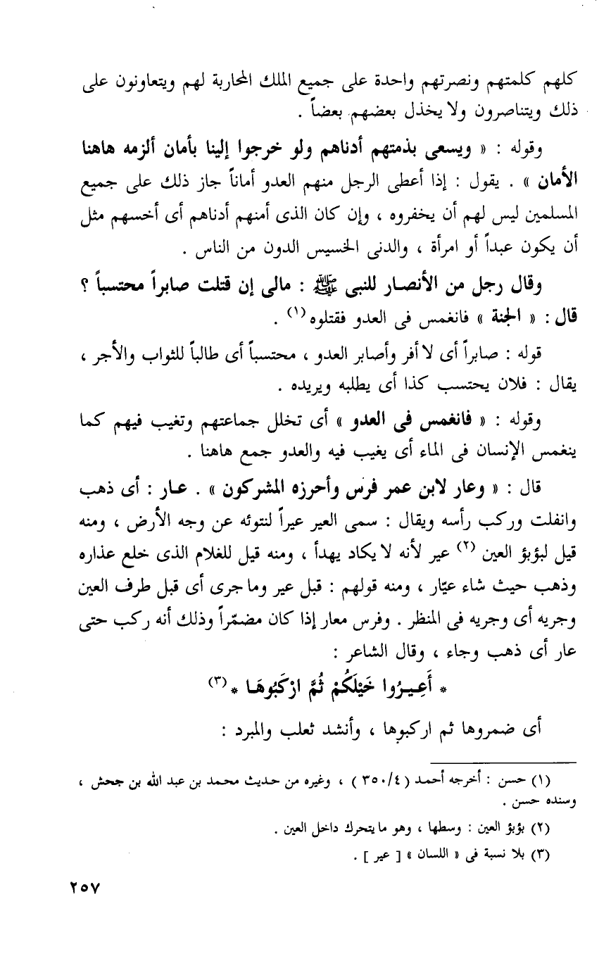 قال: وعار لابن عمر فرس فأحرزه المشركون عار: أي ذهب وانفلت وركب رأسه ويقال سمى العير عيرا لذهابه في الفلاه متوحشا لا يلوى على شيء وقيل سمى عيرا لنتوئه على وجه الأرض ومنه قيل لبؤبؤ العين2 عير لأنه لا يكاد يهدأ ومنه قيل للغلام الذي خلع عذاره وذهب حيث شاء عيار ومنه قولهم قبل عير وما جرى أي قبل طرف العين وجريه أي وجريه في النظر وفرس معار إذا كان مضمرا وذلك انه ركب حتى عار أي ذهب وجاء فضمر وقال الشاعر: