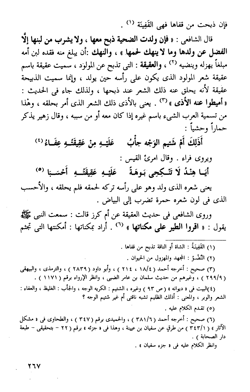 وروى الشافعي في حديث العقيقه عن أم كرز قالت سمعت النبي صلى الله عليه وسلم يقول: "اقروا الطير على مكناتها" 6. أراد بمكانتها امكنتها التي تجثم