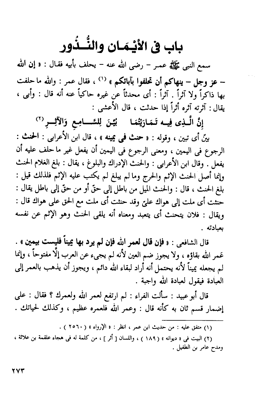 سمع النبي صلى الله عليه وسلم عمر بن الخطاب رضي الله عنه يحلف بأبيه فقال: "إن الله ينهاكم أن تحلفوا بآبائكم" 1 فقال عمر والله ما حلفت بها ذاكرا ولا آثرا. آثرا أي محدثا عن غيره حاكيا عنه انه قال وابي يقال أثرته آثرته أثرا إذا حدثت قال الاعشى: