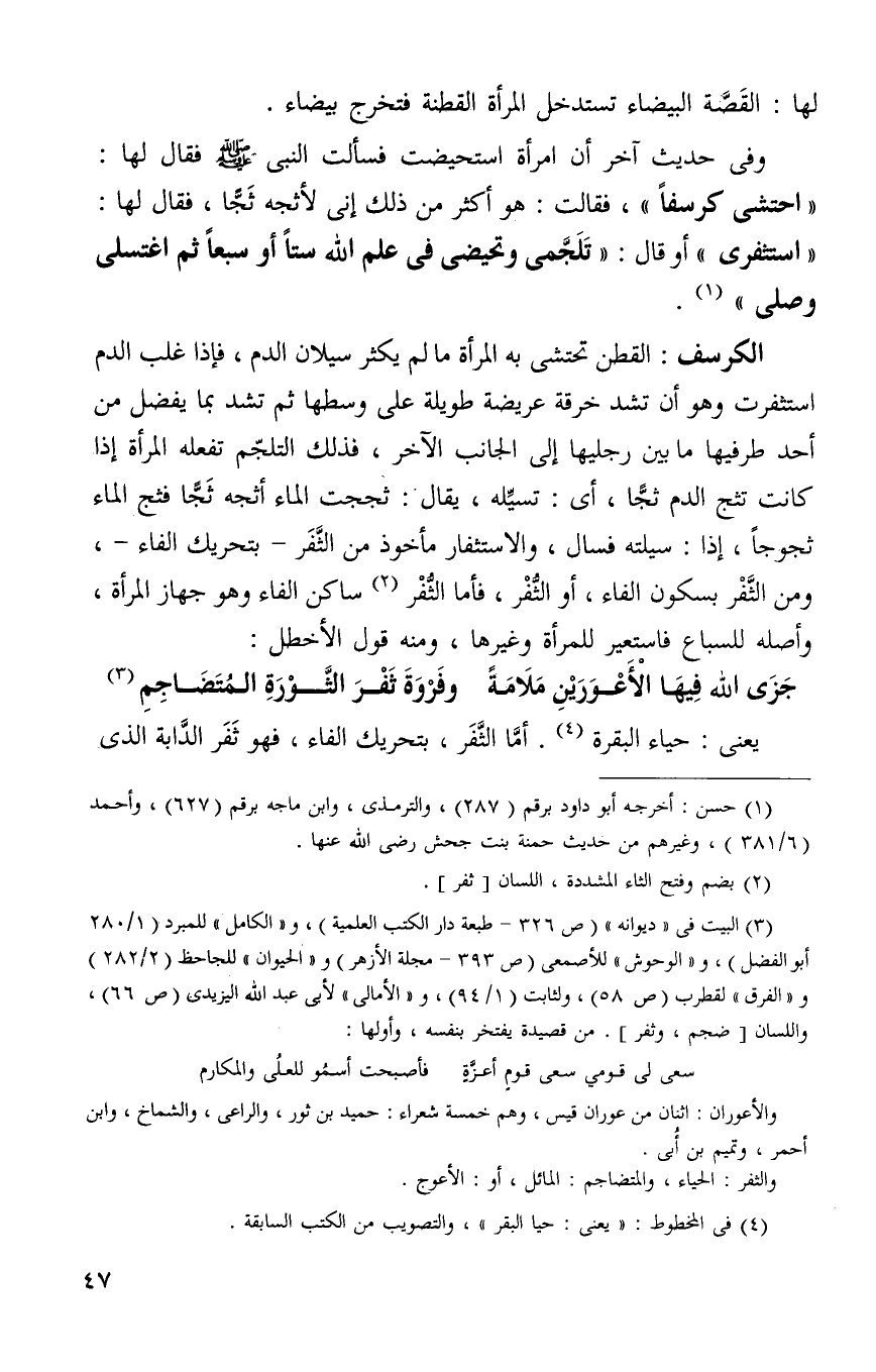 الكرسف: القطن تحتشى به المرأة ما لم يكثر سيلان الدم فإذا غلب الدم استثفرت وهو أن تشد خرقه عريضه طويله على وسطها ثم تشد بما يفضل من احد طرفيها بين رجليها إلى الجانب الاخر فذلك التلجم تفعله المرأة إذا كانت تثج الدم تجا أي: تسيله يقال: ثججت الماء اثجه ثجا فثج الماء ثجوجا اذا: سيلته فسال والاستثفار مأخوذ من الثفر - بتحريك الفاء – ومن الثفر بسكون الفاء أو الثفر فأما الثفر2 ساكن الفاء وهو جهاز المرأة وأصله للسباع فاستعير في المرأة وغيرها ومنه قول الاخطل: