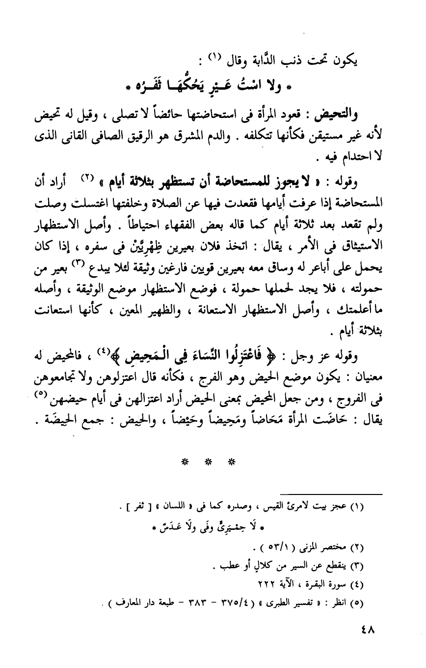 وقوله عز وجل: {فَاعْتَزِلُوا النِّسَاءَ فِي الْمَحِيضِ} 4 فالمحيض له معنيان: يكون موضع الحيض وهو الفرج فكأنه قال اعتزلوهن ولا تجامعوهن في الفروج ومن جعل المحيض بمعنى الحيض أراد اعتزالهن في أيام حيضهن5 يقال: حاضت المرأة محاضا ومحيضا وحيضا والحيض: جمع الحيضة.