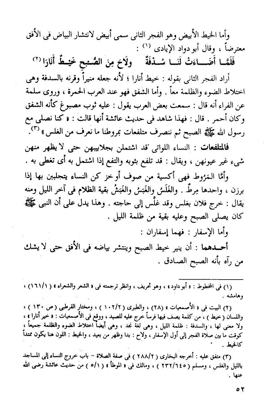 أراد الفجر الثاني بقوله: خيط أنارا لأنه جعله منيرا وقرنه بالسدفه وهي اختلاط الضوء والظلمه معا وأما الشفق فهو عند العرب الحمره وروى سلمة عن الفراء انه قال: سمعت بعض العرب يقول: عليه ثوب مصبوغ كأنه الشفق وكان احمر قال: فهذا شاهد وفي حديث عائشه رضي الله عنها انها قالت: "كنا نصلي مع رسول الله صلى الله عليه وسلم الصبح ثم ننصرف متلفعات بمروطنا ما نعرف من الغلس"3.