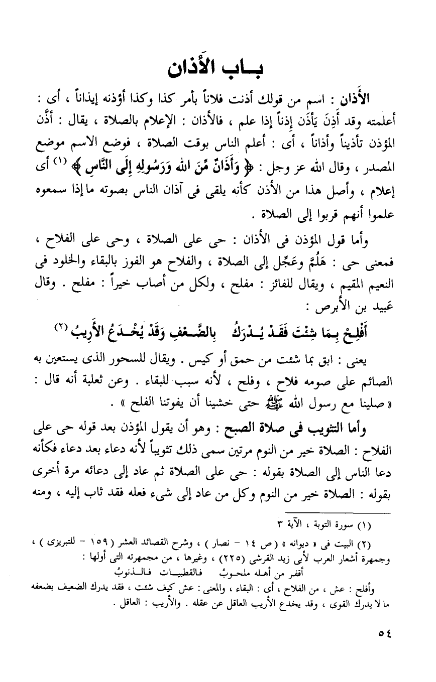 وأما قول المؤذن في الاذان: حي على الصلاة وحي على الفلاح فمعنى حي: هلم وعجل إلى الصلاة والفلاح هو الفوز بالبقاء والخلود في النعيم المقيم ويقال للفائز: مفلح ولكل من أصاب خيرا: مفلح وقال عبيد بن الأبرص: