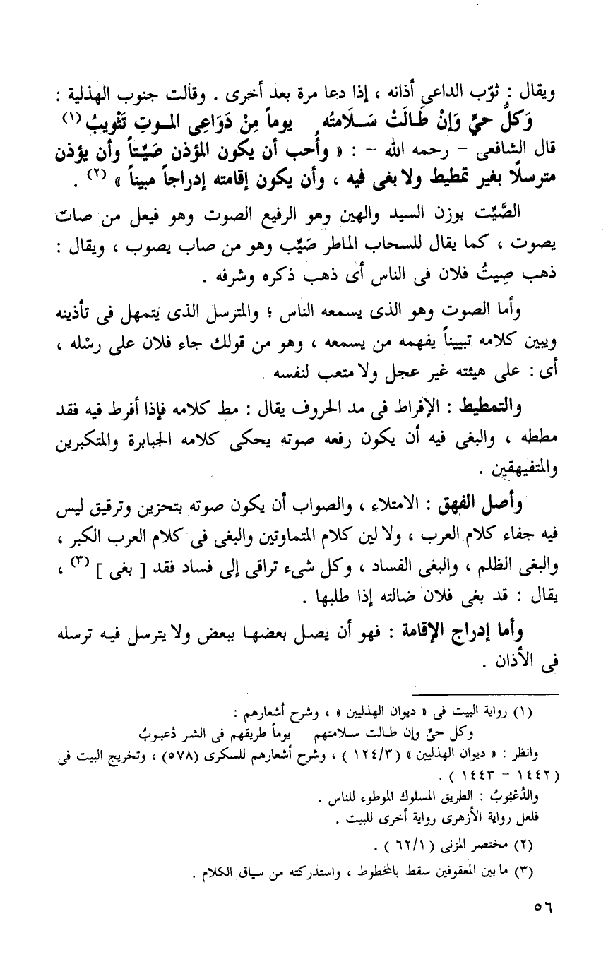 قال الشافعي: - رحمه الله -: "وأحب أن يكون المؤذن صيتا وأن يؤذن مترسلا بغير تمطيط ولا بغي فيه وأن تكون إقامته إدراجا مبينا"2