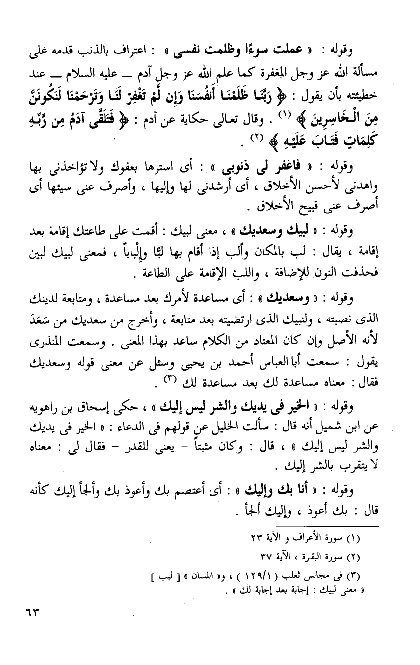وقوله: "وسعديك": أي مساعدة لامرك بعد مساعده ومتابعة لدينك الذي نصبته ولنبيك الذي ارتضيته بعد متابعة واخرج سعديك من سعد لأنه الأصل وان كان المعتاد من الكلام ساعد بهذا المعنى. وسمعت المنذري يقول: سمعت أبا العباس أحمد بن يحيى وسئل عن معنى قوله وسعديك فقال: معناه مساعده لك بعد مساعده لك3.