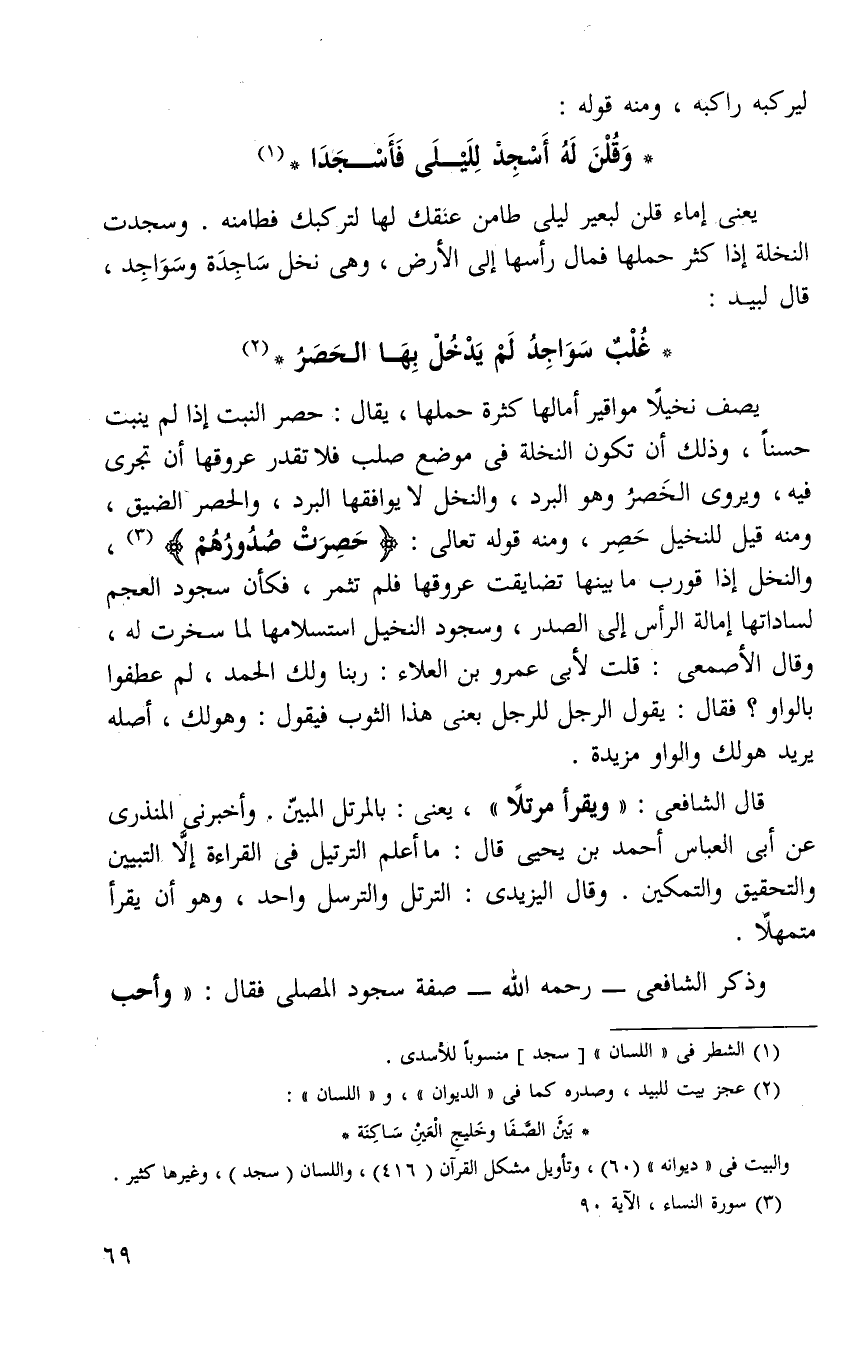 يصف نخيلا مواقير امالها كثرة حملها يقال: حصر النبت إذا لم ينبت حسنا وذلك أن تكون النخلة في موضع صلب فلا تقدر عروقها أن تجرى فيه ويروي الخصر وهو البرد والنحل لا يوافقها البرد والحصر الضيق ومنه قيل النخيل حصر ومنه قول الله تعالى: {حَصِرَتْ صُدُورُهُمْ} 3, والنخل إذا قورب ما بينها تضايقت عذوقها فلم تثمر وكان سجود العجم لسادتها إمالة الرأس إلى الصدر وسجود الظلال استسلامها لما سخرت له, وقال الاصمعي: قلت لابي عمرو بن العلاء ربنا ولك الحمد لم عطفوا بالواو فقال: يقول الرجل للرجل بعني هذا الثوب فيقول وهو لك أصله يريد هو لك والواو مزيده.
