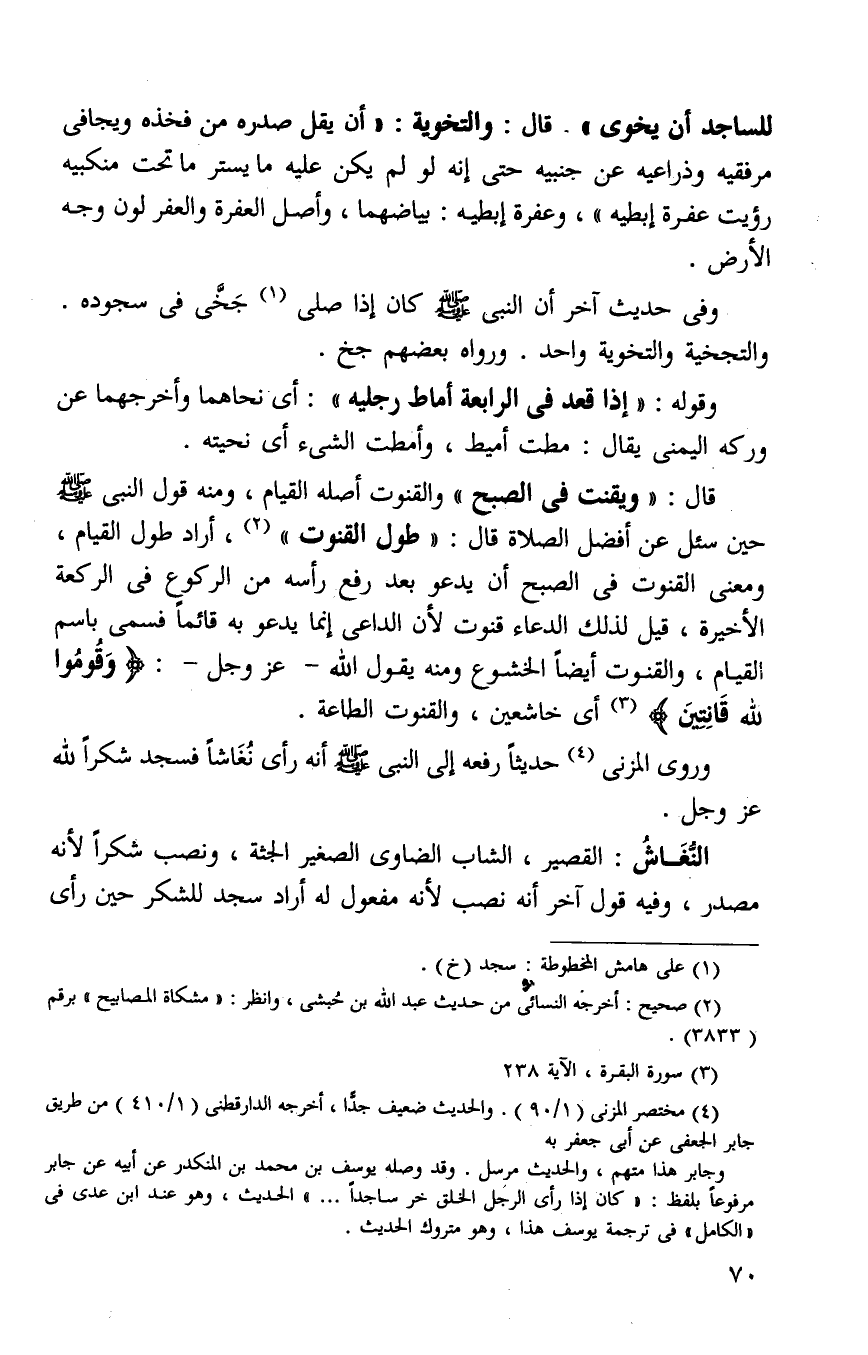 للساجد أن يخوى" قال: والتخويه: "أن يقل صدره عن فخديه ويجافي مرفقيه وذراعيه عن جنبيه حتى إن لو لم يكن عليه ما يستر ما تحت منكبيه رؤيت عفره إبطيه"، وعفرة ابطيه: بياضهما، وأصل العفرة والعفر لون وجه الأرض.