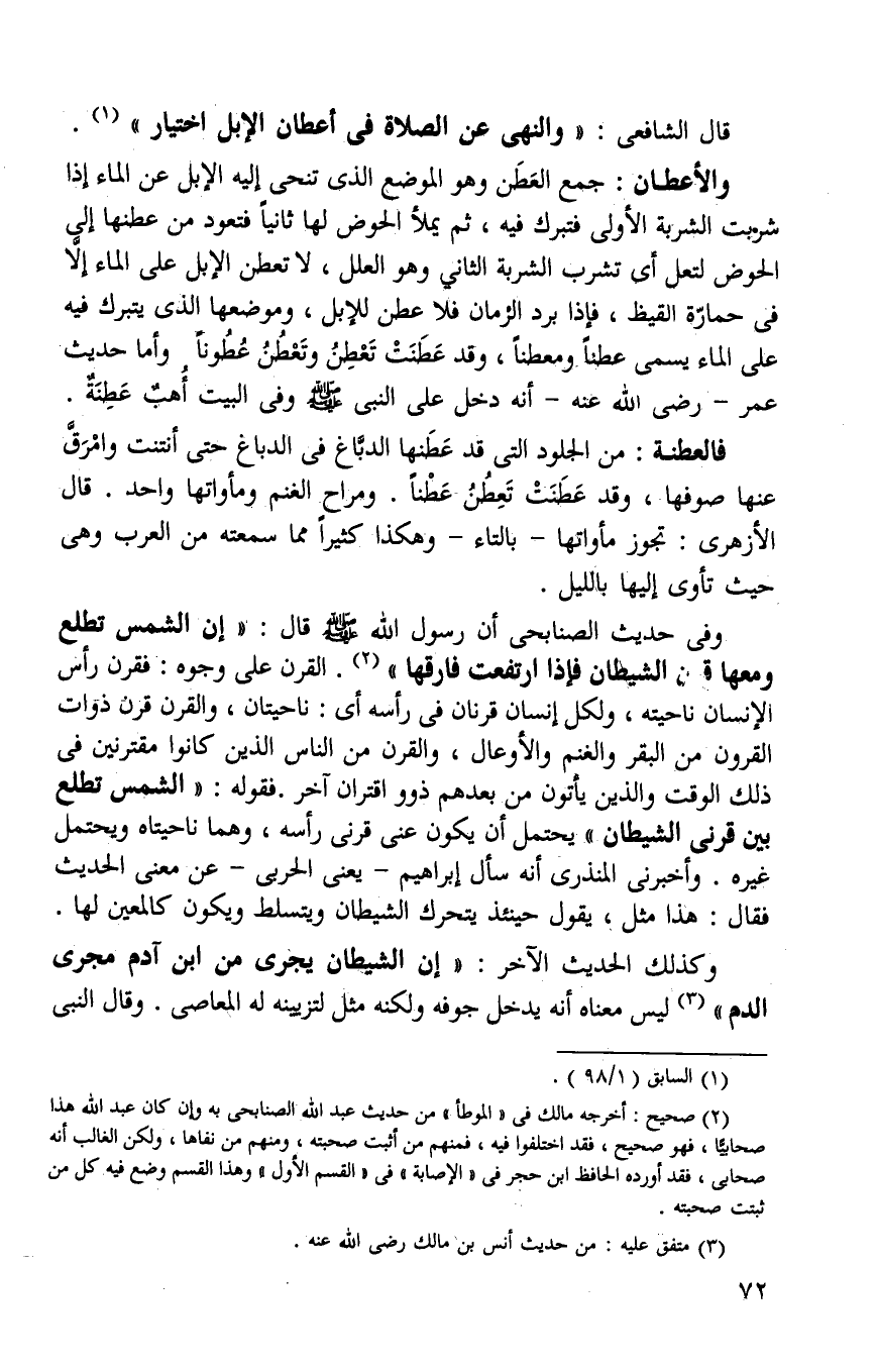 القرن على وجوه: فقرن رأس الإنسان ناحيته ولكل انسان قرنان في رأسه أي ناحيتان والقرن قرن ذوات القرون من البقر والغنم والاوعال والقرن من الناس الذين كانوا مقترنين في ذلك الوقت والذين يأتون من بعدهم ذوو اقتران آخر فقوله: "الشمس تطلع بين قرني الشيطان" يحتمل أن يكون عنى قرني رأسه وهما ناحيتاه ويحتمل غيره واخبرني المنذري انه سأل ابراهيم يعني الحربي عن معنى هذا الحديث فقال هذا مثل يقول حينئذ يتحرك الشيطان ويتسلط فيكون كالمعين لها وكذلك الحديث الاخر: "ان الشيطان يجري من ابن آدم مجرى الدم" 3 ليس معناه انه يدخل جوفه ولكنه مثل لتزيينه له المعاصي وقال النبي