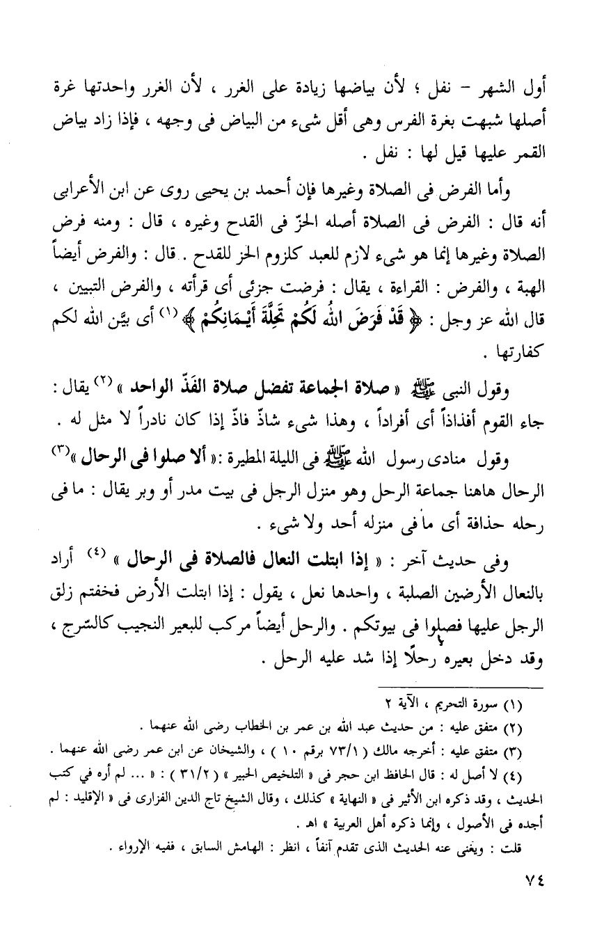 وأما الفرض في الصلاة وغيرها فإن أحمد بن يحيى روى عن ابن الأعرابي أنه قال: الفرض أصله الحز في القدح وغيره قال: ومنه فرض الصلاة وغيرها إنما هو شيء لازم للعبد كلزوم الحز للقدح قال: والفرض أيضا الهبه والفرض القراءة يقال فرضت جزئي أي قرأته والفرض التبيين قال الله عز وجل: {قَدْ فَرَضَ اللَّهُ لَكُمْ تَحِلَّةَ أَيْمَانِكُمْ} 1 أي بين الله لكم كفارتها.