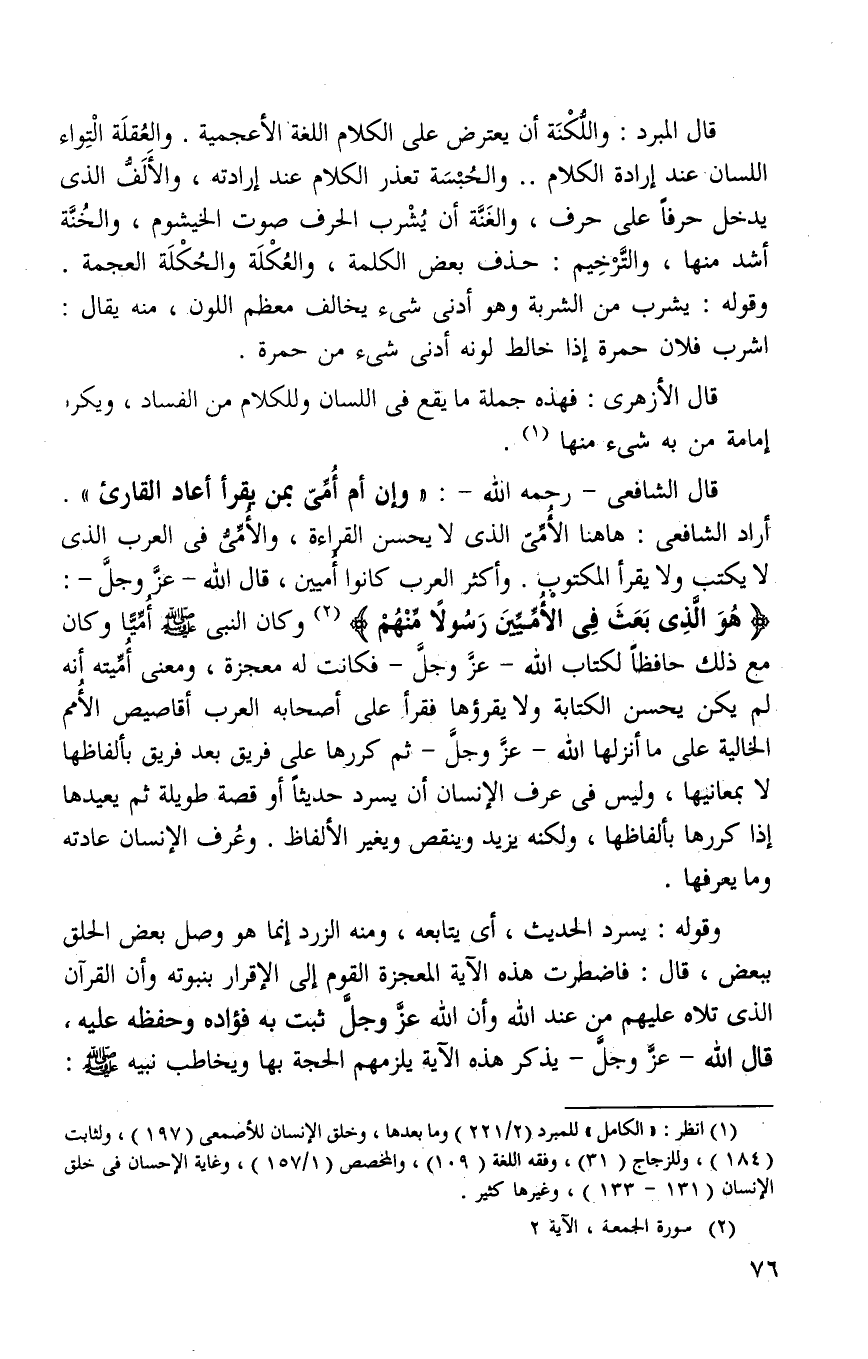 اراد الشافعي: بالامى ها هنا الذي لا يحسن قراءة القران والأمي في كلام العرب الذي لا يكتب ولا يقرأ المكتوب واكثر العرب كانوا أميين قال الله عز وجل: {هُوَ الَّذِي بَعَثَ فِي الْأُمِّيِّينَ رَسُولاً مِنْهُمْ} 2 وكان النبي صلى الله عليه وسلم أميا وكان مع ذلك حافظا لكتاب الله عز وجل فكانت آية معجزة ومعنى أميته أنه لم يكن يحسن الكتابه ولا يقرؤها فقرأ على أصحابه العرب أقاصيص الأمم الخالية على ما أنزلها الله عز وجل عليه ثم كررها على فريق بعد فريق بألفاظها لا بمعانيها وليس في عرف الإنسان أن يسرد حديثا أو قصه طويله ثم يعيدها إذا كررها بالفاظها ولكنه يزيد وينقص ويغير الألفاظ وعرف الإنسان عادته وما يعرفها.
