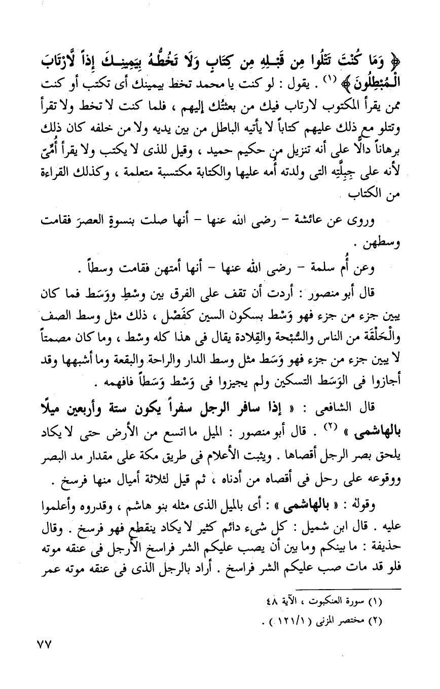 قال الشافعي: "واذا سافر الرجل سفرا يكون ستة واربعون ميلا بالهاشمي"2 قال أبو منصور: الميل ماتسع من الأرض حتى لا يكاد يلحق بصر الرجال أقصاها. ويثبت الاعلام في طريق مكة على مقدار مد البصر ووقوعه على رجل في اقصاه من ادناه ثم قيل لثلاثة اميال منها فرسخ.