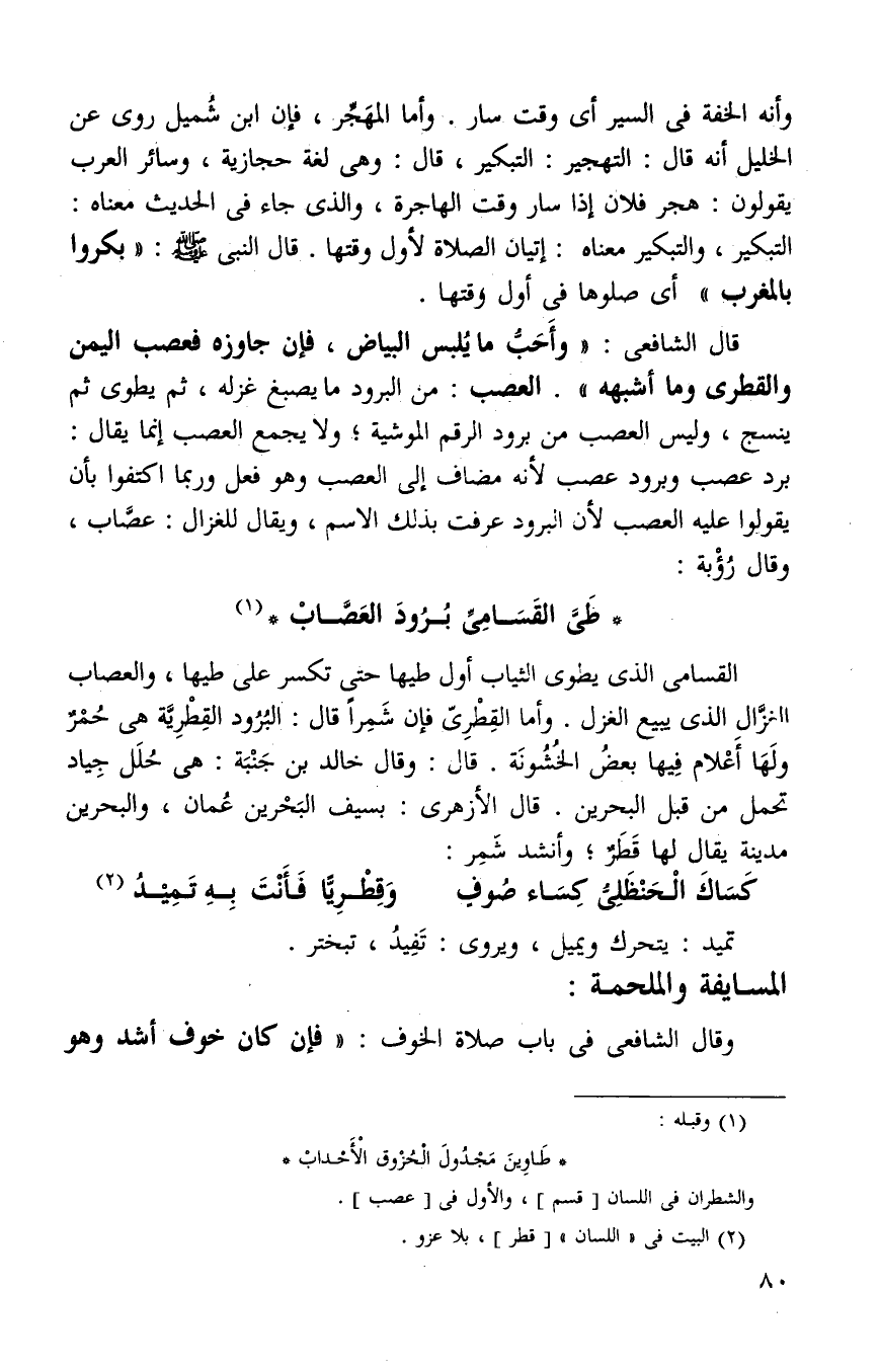 قال الشافعي: "واحب ما يلبس إلى البياض فإذا جاوزه فعصب اليمن والقطرى وما اشبهه" العصب من البرود ما يعصب غزله ثم يصبغ ثم ينسج وليس العصب من برود الرقم الموشيه ولا يجمع العصب انما يقال: برد عصب وبرود عصب لأنه مضاف إلى العصب وهو فعل وربما اكتفوا بأن يقولوا عليه العصب لان البرود عرفت بذلك الاسم ويقال للغزال عصاب قال رؤبه: