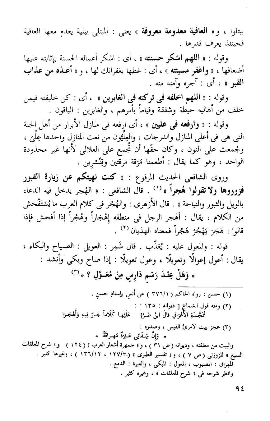 وروى الشافعي الحديث المرفوع: "كنت نهيتكم عن زيارة القبور فزوروها ولا تقولوا هجرا"1 قال الشافعي: "الهجر يدخل فيه الدعاء بالويل والثبور والنياحه" قال الازهري: الهجر في كلام العرب ما يستفحش من الكلام يقال اهجر الرجل في منطقه اهجارا وهجرا إذا افحش فإذا قالوا هجر يهجر هجرا فمعناه الهذيان2.