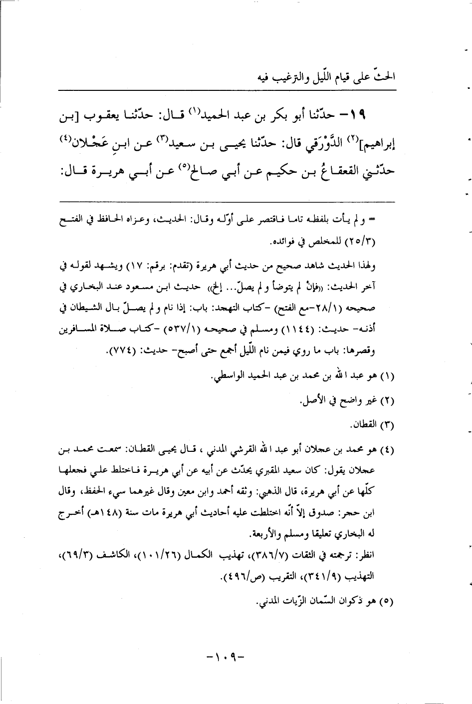 19 - حَدَّثَنَا أَبُو بَكْرٍ بْنُ عَبْدِ الْحَمِيدِ قَالَ حَدَّثَنَا يَعْقُوبُ بْنُ إِبْرَاهِيمَ الدَّوْرَقِيُّ قَالَ حَدَّثَنَا يَحْيَى بْنُ سَعِيدٍ عَنِ ابْنِ عَجْلانَ حَدَّثَنِي الْقَعْقَاعُ بْنُ حَكِيمٍ عَنْ أَبِي صَالِحٍ عَنْ أَبِي هُرَيْرَةَ قَالَ -[110]- قَالَ رَسُولُ اللَّهِ صَلَّى اللَّهُ عَلَيْهِ وَسَلَّمَ رَحِمَ اللَّهُ رَجُلا قَامَ مِنَ اللَّيْلِ فَصَلَّى وَأَيْقَظَ امْرَأَتَهُ فَصَلَّتْ فَإِنْ أَبَتْ نَضَحَ فِي وَجْهِهَا مِنَ الْمَاءِ وَرَحِمَ اللَّهُ امْرَأَةً قَامَتْ مِنَ اللَّيْلِ فَصَلَّتْ ثُمَّ أَيْقَظَتْ زَوْجَهَا فَإِنْ أَبَى نَضَحَتْ فِي وَجْهِهِ مِنَ الْمَاءِ.