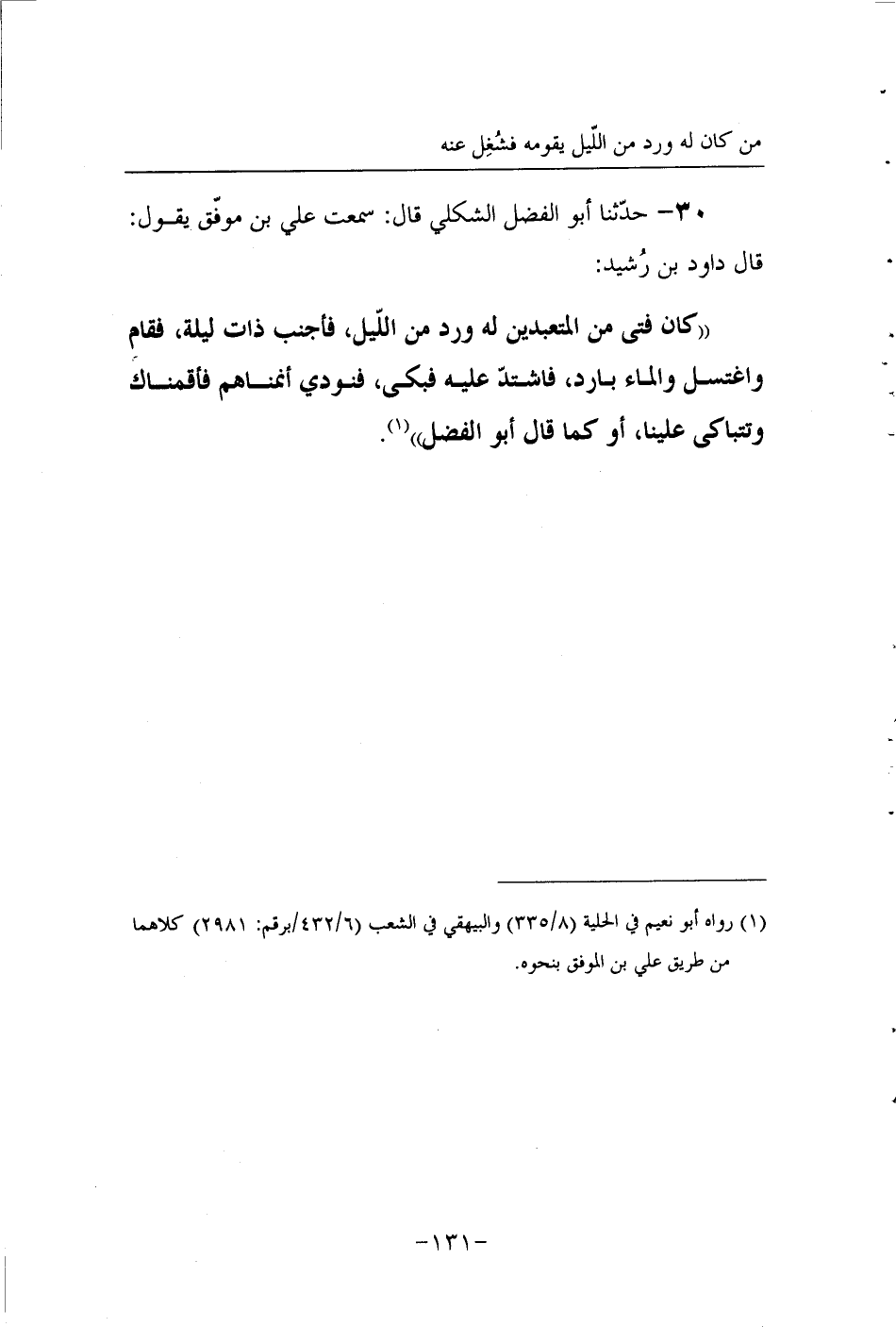 30 - حَدَّثَنَا أَبُو الْفَضْلِ الشِّكْلِيُّ قَالَ سَمِعْتُ عَلِيَّ بْنَ مُوَفَّقٍ يَقُولُ قَالَ دَاوُدُ بْنُ رُشَيْدٍ: كَانَ فَتًى مِنَ الْمُتَعَبِّدِينَ لَهُ وِرْدٌ مِنَ اللَّيْلِ فَأَجْنَبَ ذَاتَ لَيْلَةٍ فَقَامَ وَاغْتَسَلَ وَالْمَاءُ بَارِدٌ فَاشْتَدَّ عَلَيْهِ فَبَكَى، فَنُودِيَ: أَنَمْنَاهُمْ فَأَقَمْنَاكَ وَتَتَبَاكَى عَلَيْنَا، أَوْ كَمَا قَالَ أَبُو الْفَضْلِ.