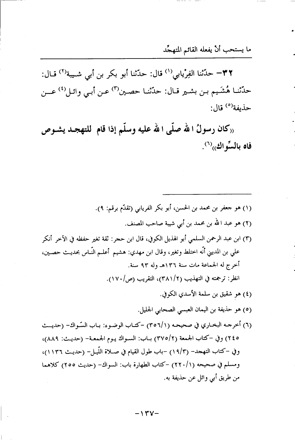 32 - حَدَّثَنَا الْفِرْيَابِيُّ قَالَ حَدَّثَنَا أَبُو بَكْرِ بْنُ أَبِي شَيْبَةَ قَالَ حَدَّثَنَا هُشَيْمُ بْنُ بَشِيرٍ قَالَ حَدَّثَنَا حُصَيْنٌ عَنْ أَبِي وَائِلٍ عَنْ حُذَيْفَةَ قَالَ كَانَ رَسُولُ اللَّهِ صَلَّى اللَّهُ عَلَيْهِ وَسَلَّمَ إِذَا قَامَ لِلتَّهَجُّدِ يَشُوصُ فَاهُ بِالسِّوَاكِ.
