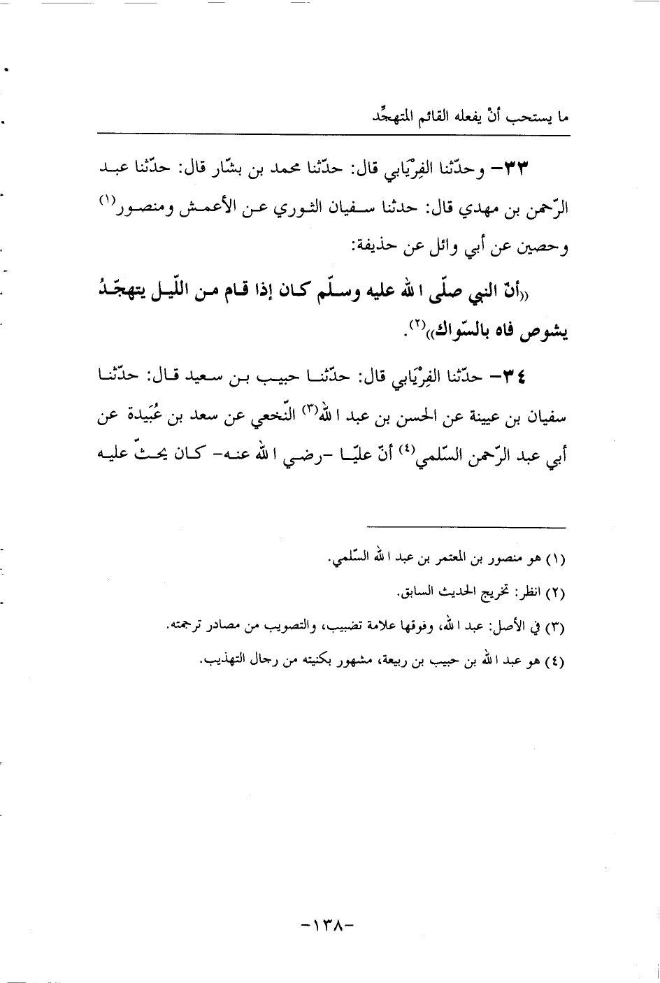 33 - وَحَدَّثَنَا الْفِرْيَابِيُّ قَالَ حَدَّثَنَا مُحَمَّدُ بْنُ بَشَّارٍ قَالَ حَدَّثَنَا عَبْدُ الرَّحْمَنِ بْنُ مَهْدِيٍّ قَالَ حَدَّثَنَا سُفْيَانُ الثَّوْرِيُّ عَنِ الأَعْمَشِ وَمَنْصُورٍ وَحُصَيْنٍ عَنْ أَبِي وَائِلٍ عَنْ حُذَيْفَةَ أَنَّ النَّبِيَّ صَلَّى اللَّهُ عَلَيْهِ وَسَلَّمَ كَانَ إِذَا قَامَ مِنَ اللَّيْلِ يَتَهَجَّدُ يَشُوصُ فَاهُ بالسواك.