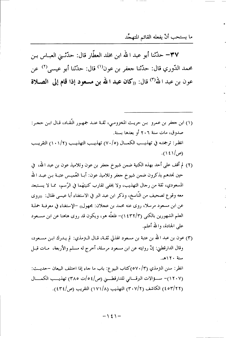 37 - حدثنا أبو عبد الله ابْنُ مَخْلَدٍ الْعَطَّارُ قَالَ حَدَّثَنَا الْعَبَّاسُ بْنُ مُحَمَّدٍ الدُّورِيُّ قَالَ حَدَّثَنَا جَعْفَرُ بْنُ عَوْنٍ قَالَ حَدَّثَنَا أَبُو عِيسَى عَنْ عَوْنِ بْنِ عَبْدِ اللَّهِ قَالَ كَانَ عَبْدُ اللَّهِ بْنُ مَسْعُودٍ إِذَا قَامَ إِلَى الصَّلاةِ