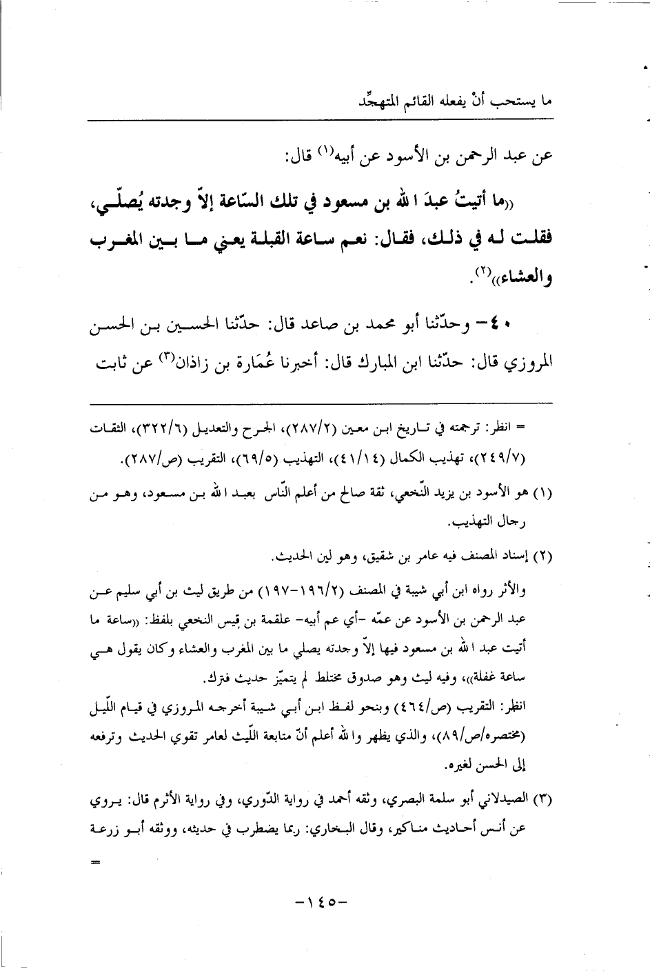 40 - وَحَدَّثَنَا أَبُو مُحَمَّدِ بْنُ صَاعِدٍ قَالَ حَدَّثَنَا الْحُسَيْنُ بْنُ الْحَسَنِ الْمَرْوَزِيُّ قَالَ حَدَّثَنَا ابْنُ الْمُبَارَكِ قَالَ أَخْبَرَنَا عُمَارَةُ بْنُ زَاذَانَ عَنْ ثَابِتٍ -[146]- الْبُنَانِيِّ قَالَ كَانَ أنس بن مالك يصلي ما بَيْنَ الْمَغْرِبِ وَالْعِشَاءِ وَيَقُولُ هَذِهِ نَاشِئَةُ اللَّيْلِ.