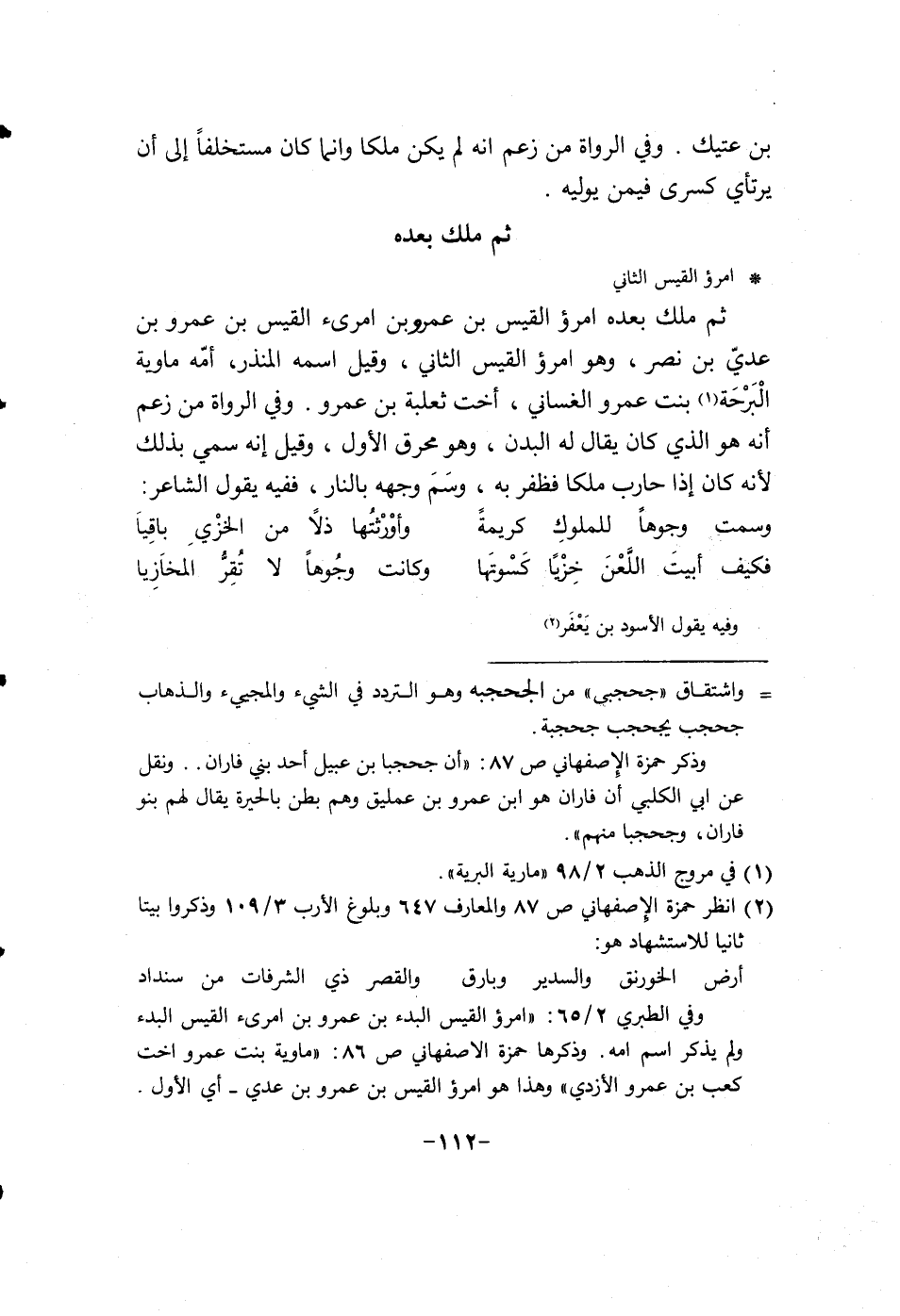 ثم ملك بعده أمرؤ القيس بن عمرو بن أمرؤ القيس بن عمرو بن عدي بن نصر وهو أمرؤ القيس الثاني وقيل أسمه المنذر أمه ماوية البرحة بنت عمرو الغساني أخت ثعلبة بن عمرو. وفي الرواة من زعم إنه هو الذي كان يقال له البدن وهو محرق الأول وقيل إنه سمي بذلك إنه أذا حارب ملكا وضفر به وسم وجهه بالنار ففيه يقول الشاعر: