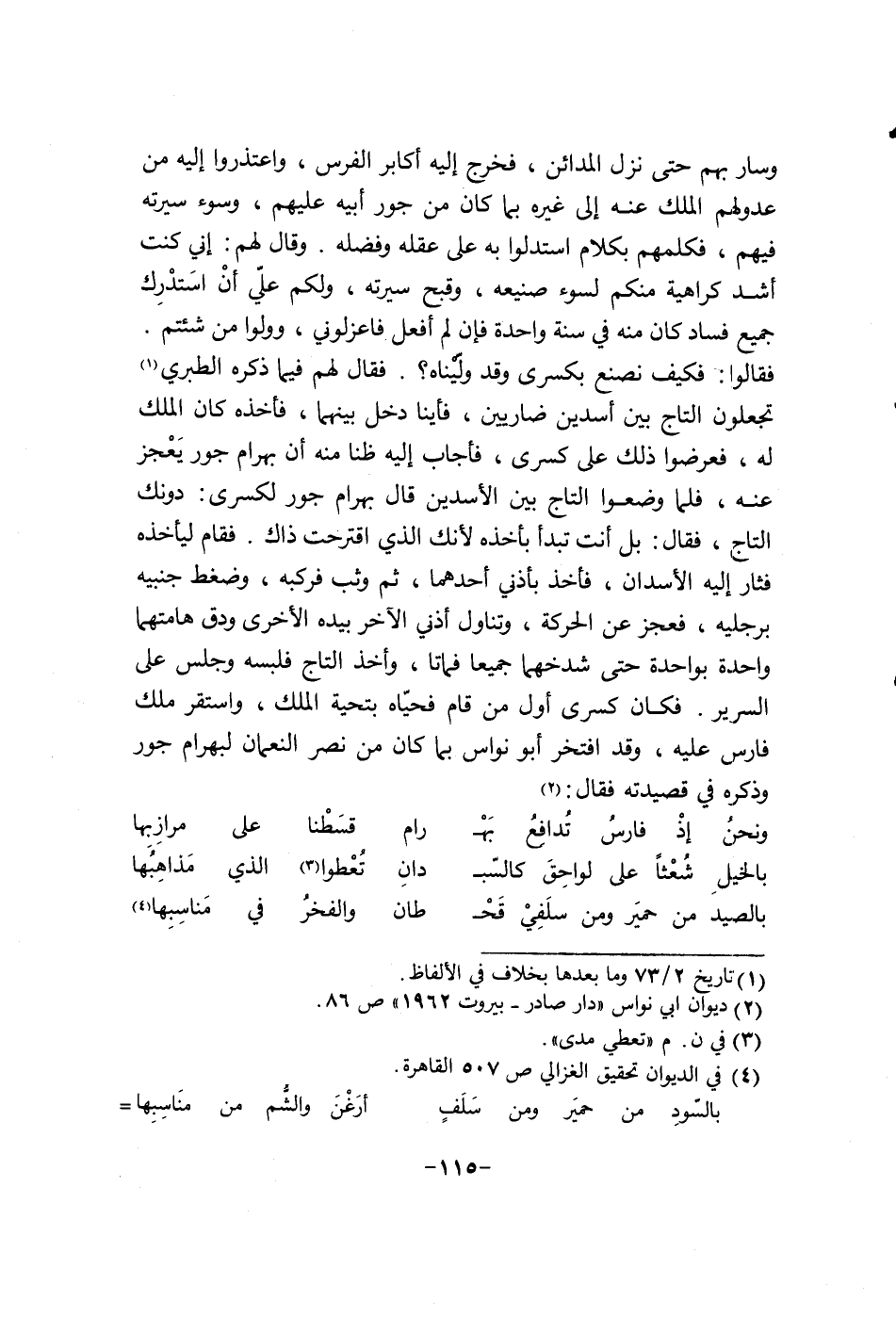 وسار بهم حتى نزل المدائن فخرج اليه أكابر الفرس وأعتذروا ليه من عدولهم الملك عنه الى غيره بما كان من جور أبيه عليهم وسوء سيرته فيهم فكلمهم بكلام أستدلوا به على عقله وفضله. وقال لهم: أني كنت أشد كراهية منكم لسوء صنيعه وقبح سيرته ولكم علي إن أستدرك جميع فساد كان منه في سنة واحدة فان لم أفعل فاعزلوني وولوا من شئتم. فقالوا: فكيف نصنع بكسرى وقد وليناه؟. فقال لهم فيما ذكره الطبري تجعلون التاج بين أسدين ضاريين فاينا دخل بينهما فاخذه كان الملك له فعرضوا ذلك على كسرى فاجاب اليه ظناً منه إن برهام جور يعجز عنه فلما وضعوا التاج بين الاسدين قال برهام جور لكسرى: دونك التاج فقال: بل أنت تبدأ باخذه لانك الذي أقترحت ذلك. فقام ليأخذه فثار ليه الاسدان فاخذ باذني أحدهما ثم وثب فركبه وضغط جنبيه برجليه فعجز عن الحركة وتناول أذني الاخر بيده الاخرى ودق هامتها واحدة بواحدة حتى شدخهما جميعاً فماتا وأخذ التاج فلبسه وجلس على السرير فكان كسرى أول من قام فحياه بتحية الملك وأستقر ملك فارس عليه وقد أفتخر أبو نواس بما كان مت نصر النعمان لبهرام جور وذكره في قصيدته فقال: