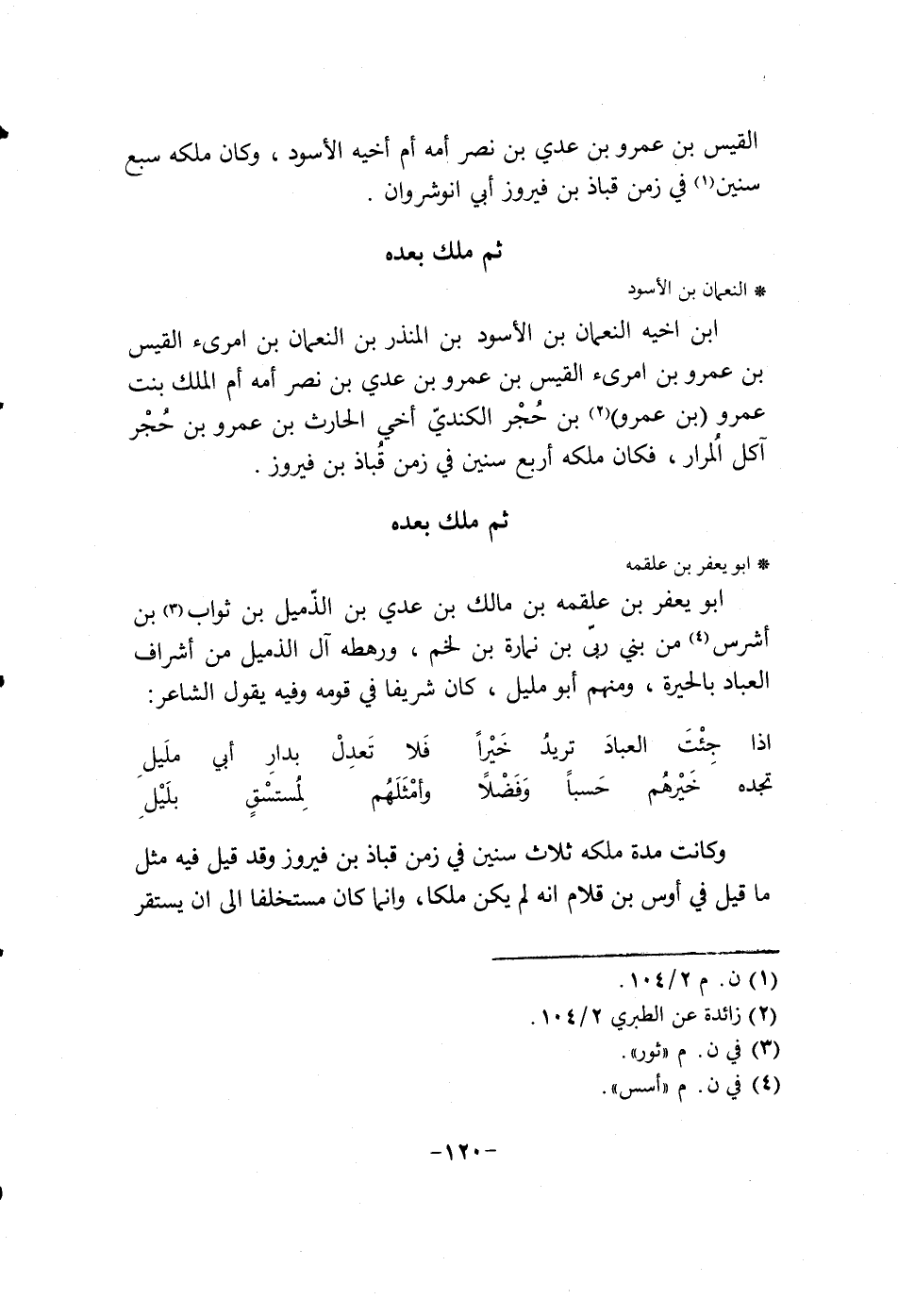 بن أخيه النعمان بن الاسود بن المنذر بن النعمان بن أمرؤ القيس بن عمرو بن أمرؤ القيس بن عمرو بن عدي بن نصر أمه أم مالك بنت عمر بن عمر بن حجر الكندي أخي الحارث بن عمرو بن حجر آكل المرار فكان ملكه الربع سنين في زمن قباذ بن فيروز.