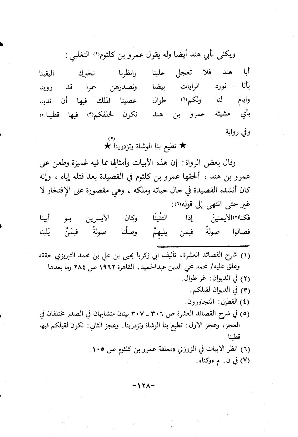 وفي رواية: " تطيع بنا الوشاة وتزدرينا " وقال بعض الرواة: إن هذه الابيات وأمثالها مما فيه غميزة وطعن على عمرو بن هند الحقها عمرو أبن كلثوم في القصيدة بعد قتله أياه وإنه كان أنشده القصيدة في حال حياته وملكه وهي مقتصرة على الافتخار لا غير حتى أنتهى الى قوله: