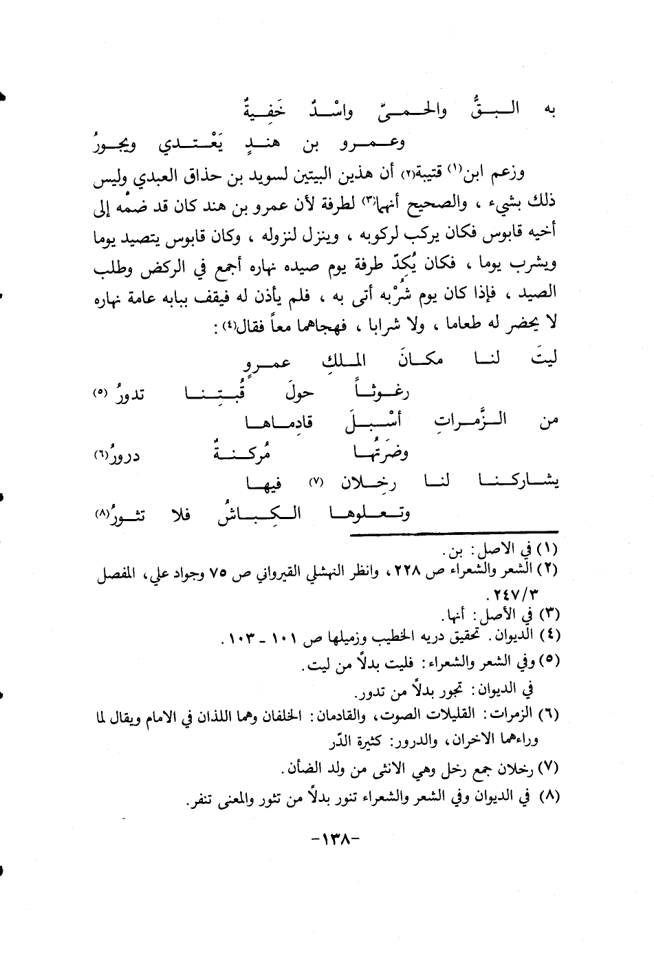 وزعم أبن قتيبة إن هذين البيتين لسويد بن حذاق العبدي وليس ذلك بشيء، والصحيح إنهما لطرفة لان عمرو بن هند كان قد ضمه الى أخيه قابوس فكان يركب لركوبه، وينزل لنزوله، وكان قابوس يتصيد يوماً ويشرب يوماً، فكان يكد طرفة يوم صيده نهاره أجمع في الركض وطلب الصيد، فإذا كان يوم شربه أتى به، فلم يأذن له فيقف ببابه عامة نهاره لا يحضر له طعاماً، ولا شراباً، فهجاهما معاً فقال: