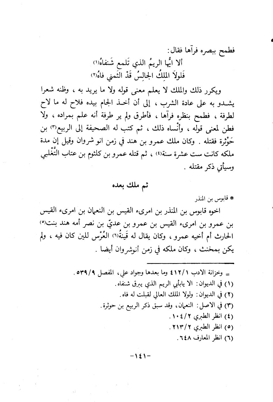 ويكرر ذلك والملك لا يعلم معنى قوله ولا ما يريد به، وظنه شعرا يشدو به على عادة الشرب، الى أن أخذ الجام بيده فلاح له ما لاح لطرفة فطمح بنظره فرآها، فأطرق ولم ير طرفة أنه علم بمراده، ولا فطن لمعنى قوله وأنساه ذلك ثم كتب له الصحيفة الى الربيع بن حوثره وقتله. وكان ملك عمرو بن هند في زمن أنوشروان وقيل إن مدة ملكه كانت ست عشرة سنة ثم قتله عمرو بن كلثوم بن عتاب التغلبي وسياتي ذك مقتله.