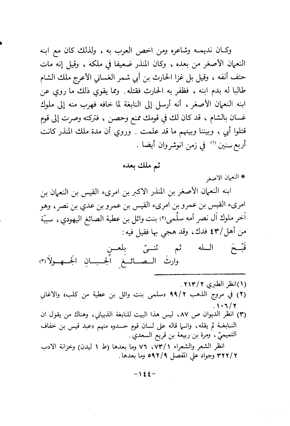 ابنه النعمان الاصغر بن المنذر الاكبر بن أمرئ القيس بن النعمان بن أمرئ القيس بن عمرو بن أمرئ القيس بن عمرو بن عدي بن نصر، وهو أخر ملوك آل نصر أمه سلمى بنت وائل بن عطية الصائغ اليهودي، سبية من أهل 43 فلك، وفد هجي بها فقيل فيه: