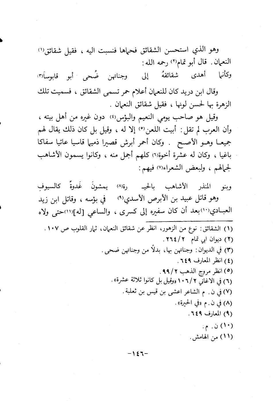 وهو الذي أستحسن الشقائق فحماها فنسبت اليه، فقيل شقائق النعمان. قال أبو تمام رحمه الله: