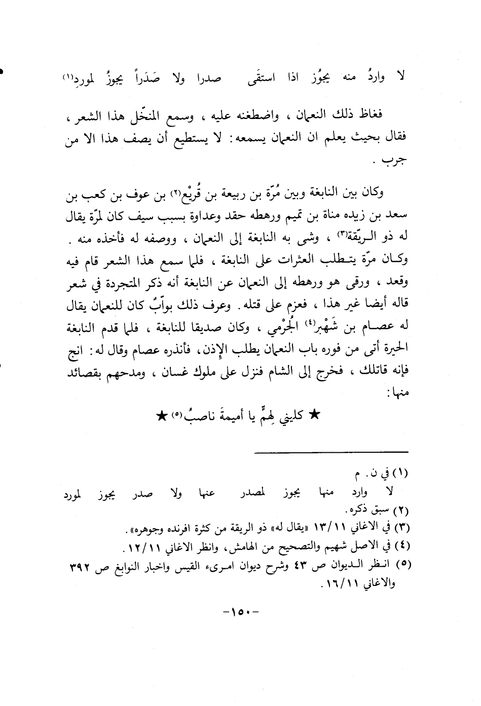 وكان بين النابغة وبين مرة بن ربيعة بن قريع بن عوف بن كعب بن سعد بن زيدة مناة بن تميم ورهطه حقد وعداوة بسبب سيف كان لمرة يقال له ذو الريقة، وشى به النبغة الى النعمان، ووصفه له فأخذه منه. وكان مرة يتطلب العثرات على النابغة، فلما سمع هذا الشعر قام فيه وقعد، ورقى هو ورهطة الى النعمان عن النابغة إنه ذكر المتجرد في شعر قاله أيضاً غير هذا. فعزم على قتله، وعرف ذلك بواب كان للنعمان يقال له عصام بن شبير الجرمي. وكان صديقاً للنابغة. فلما قدم النابغة الحيرة أتى من فوره باب النعمان يطلب الاذن فانذره عصام وقال له: أنج فانه قاتلك، فخرج الى الشام فنزل على ملوك غسان، ومدحهم بقصائد منها: " كليني همّ يا أميمة ناصب "