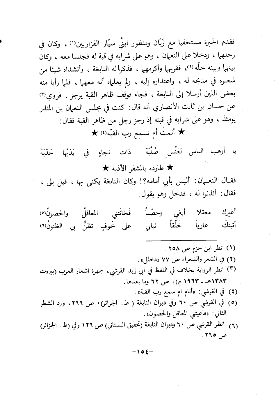 فقدم الحيرة مستخفيا مع زيان ومنظور أبن سيار الفزاريين، وكان في رحلهما، ودخلا على النعمان وهو على شرابه في قبة له فجلسا معه، وكان بينهما وبينه خلة، فقربهما وأكرمهما، فذكرا اله النابغة، وأنشداه شيئاً من شعره في مديحه له، وأعتذاره اليه، ولم يعلماه إنه معهما، فلما رأيا منه بعض اللين أرسلا الى النابغة، فجاء فوقف ظاهر القبة يرجز. فروي عن حسان بن ثابت الأنصاري إنه قال: كنت في مجلس النعمان بن المنذر يومئذ، وهو على شرابه في قبته أذ رجز رجل من ظاهر القبة فقال: أنمت أم تسمع رب القبة